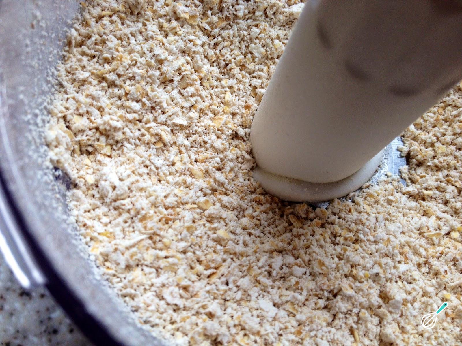 Para fazer cookies de laranja, comece por bater a aveia, a granola e a farinha de trigo no liquidificador ou em um processador de alimentos. Reserve a mistura.