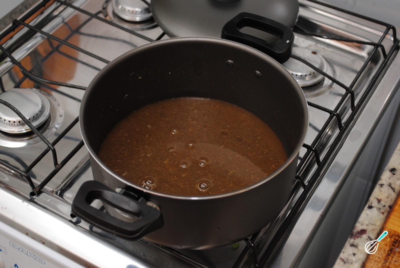 Coloque a manteiga, o suco e as raspas de laranja, a glicose de milho e o açúcar em uma panela. Cozinhe em fogo baixo, mexendo sempre até o açúcar e a manteiga derreterem. Misture estes ingredientes com os do passo anterior.