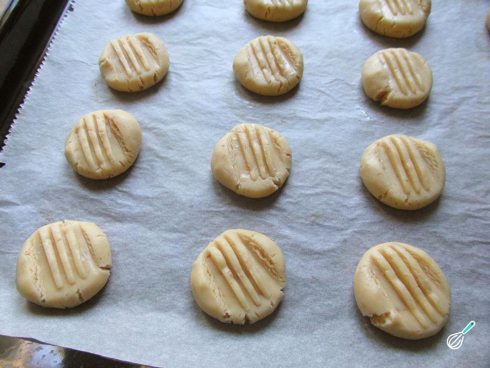 Forre uma assadeira com papel manteiga e coloque a massa sobre ela, em porções de biscoitinhos pequenos, usando uma colher de sobremesa. Asse os biscoitos em forno preaquecido a 180ºC até dourarem (entre 8 e 10 minutos). Retire do forno e polvilhe com açúcar cristal.