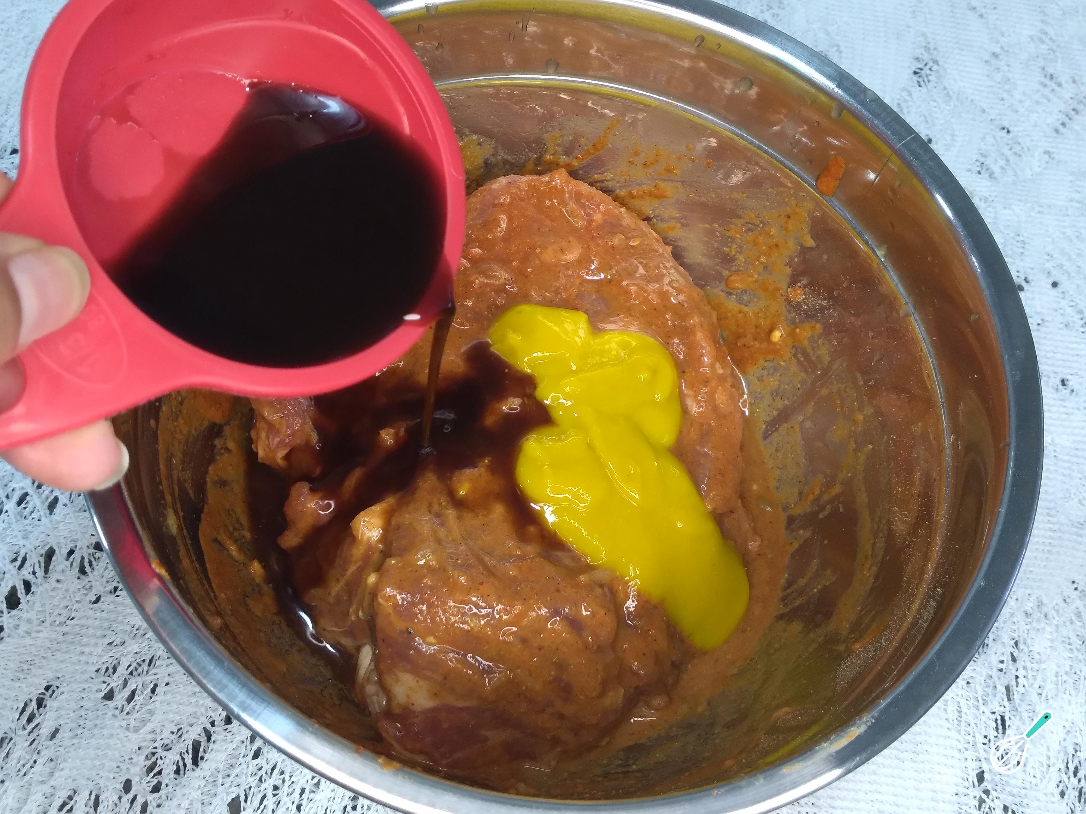 Depois disso, acrescente a mostarda amarela, o shoyu e o molho inglês. Novamente misture tudo muito bem, para que a carne absorva os sabores. Embale o bowl com um papel filme e leve para gelar e descansar por no mínimo 1 hora. Esse descanso é importante para que a carne absorva os sabores dos temperos.