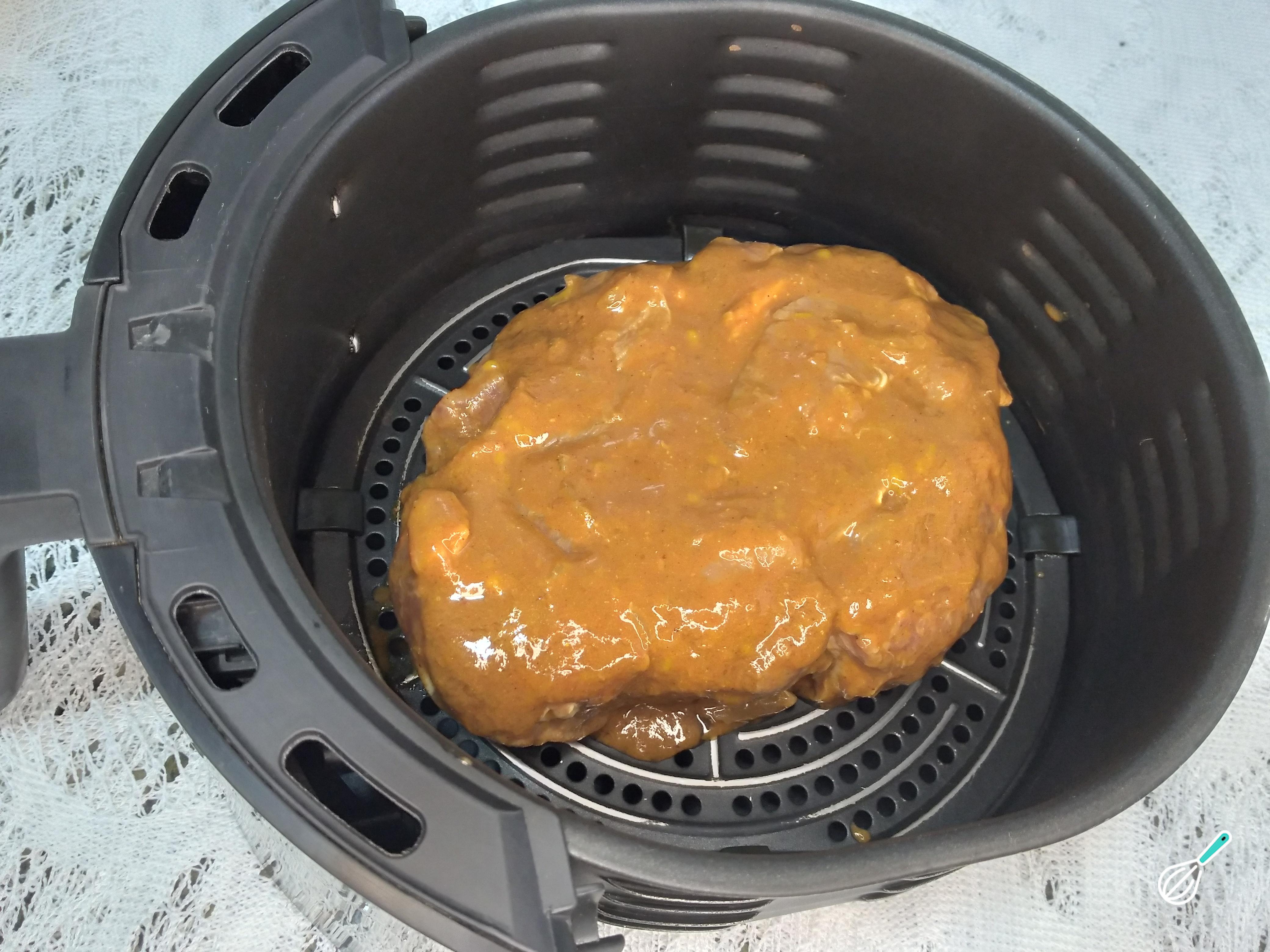 Em seguida, coloque a carne no cesto da airfryer e leve para assar à 180º. Asse por 30 minutos de cada lado.