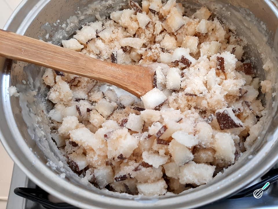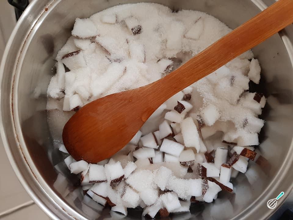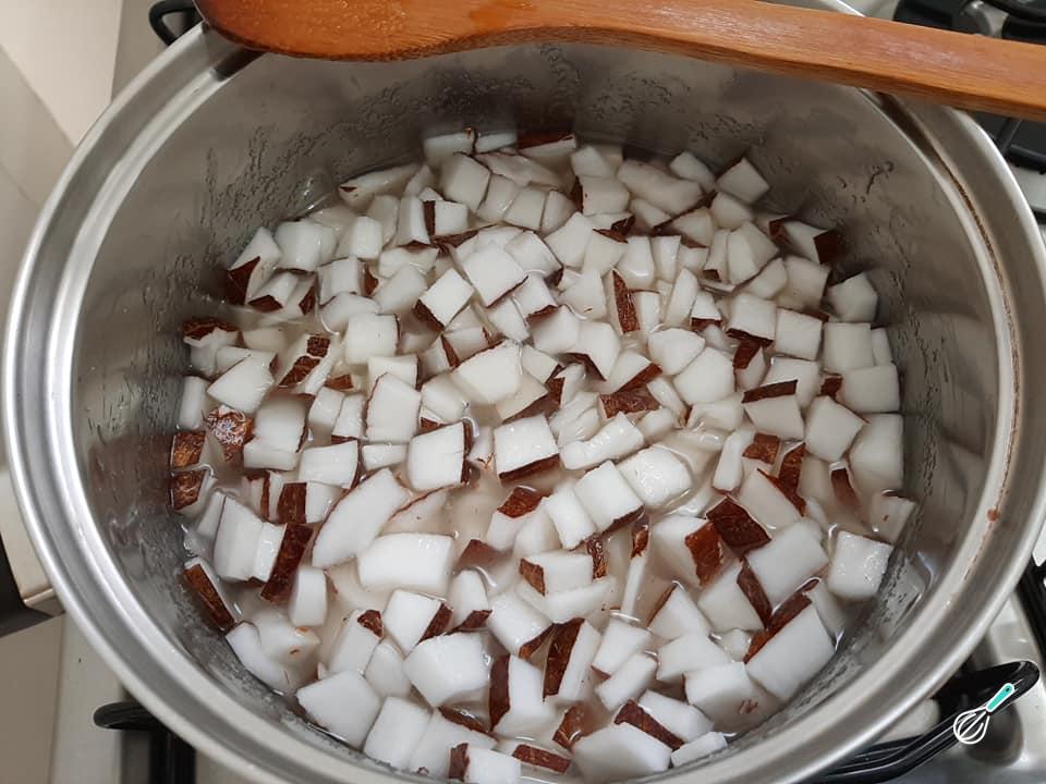 Após cortar o coco seco em cubinhos, coloque-o numa panela funda com a água e o açúcar.
