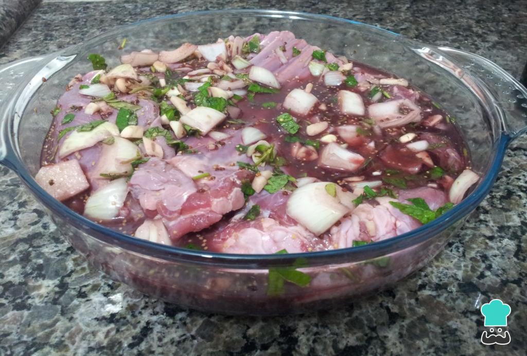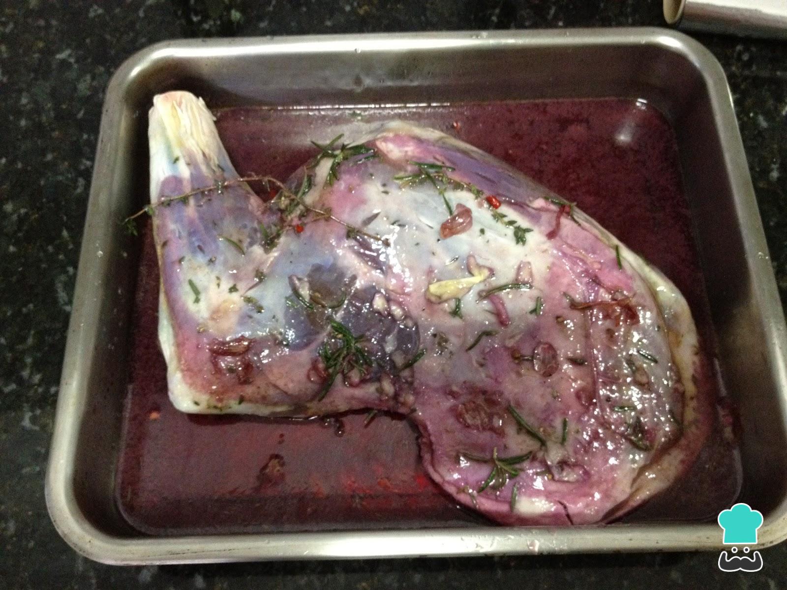 Para preparar esta receita para o Domingo de Páscoa, comece por colocar a carne marinando por 12 horas na geladeira, numa vasilha grande ou saco de plástico com os alhos esmagados, as cebolas picadas, o vinho e as ervas aromáticas.