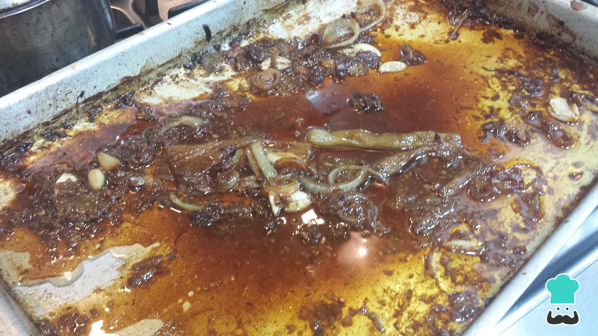 Retire a carne e reserve coberta com papel alumínio, para que não esfrie enquanto prepara o molho. Para isso leve a assadeira ao fogo médio com o vinho e, com uma espátula ou colher de pau, raspe o fundo e laterais, para libertar os sucos grudados.