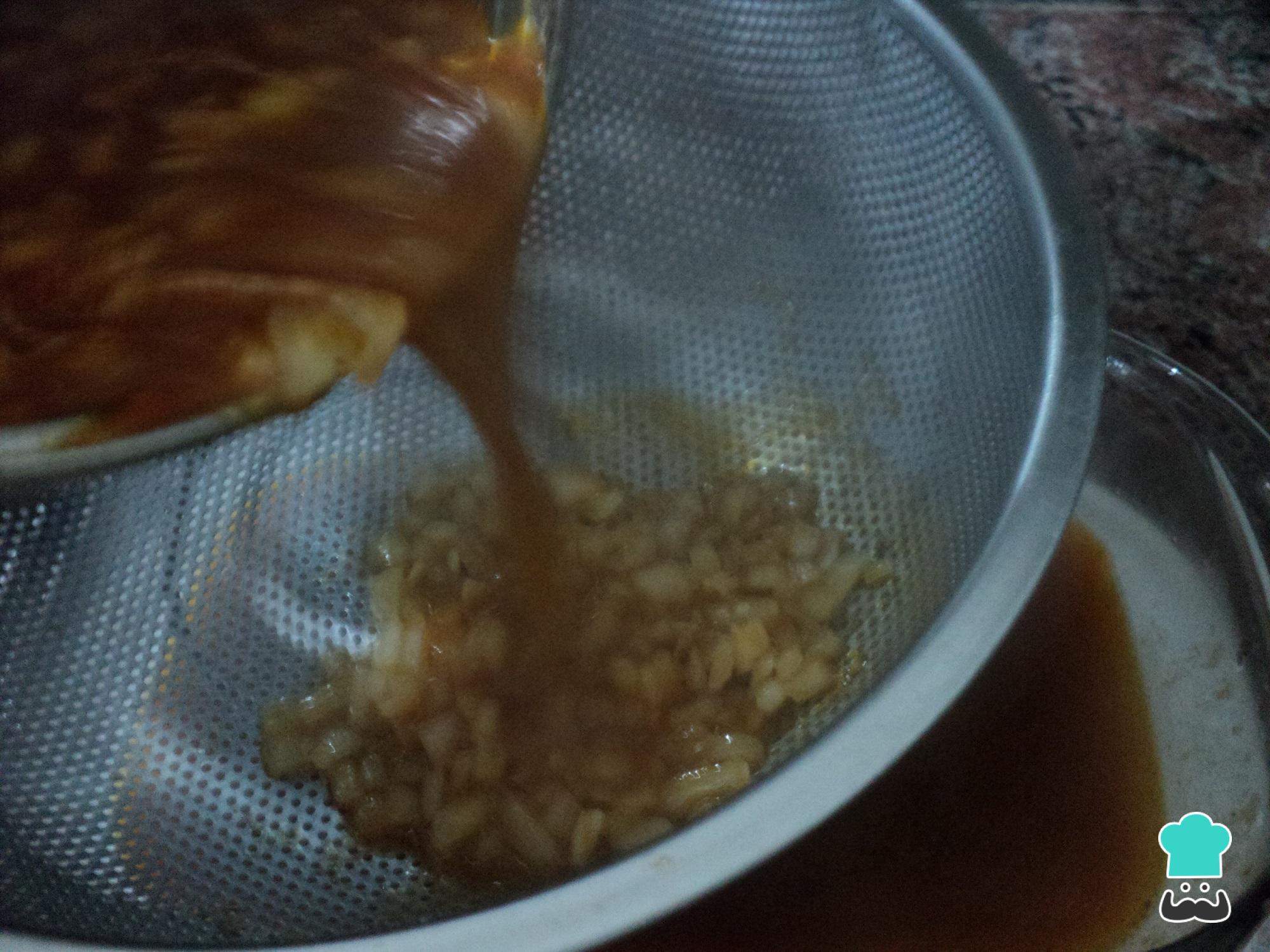Espere o álcool do vinho evaporar para adicionar a farinha e misturar, até obter uma pasta. Acrescente o caldo de legumes ou o caldo de carne e deixe cozinhar até reduzir. Depois coe esse molho, espremendo bem os sólidos.