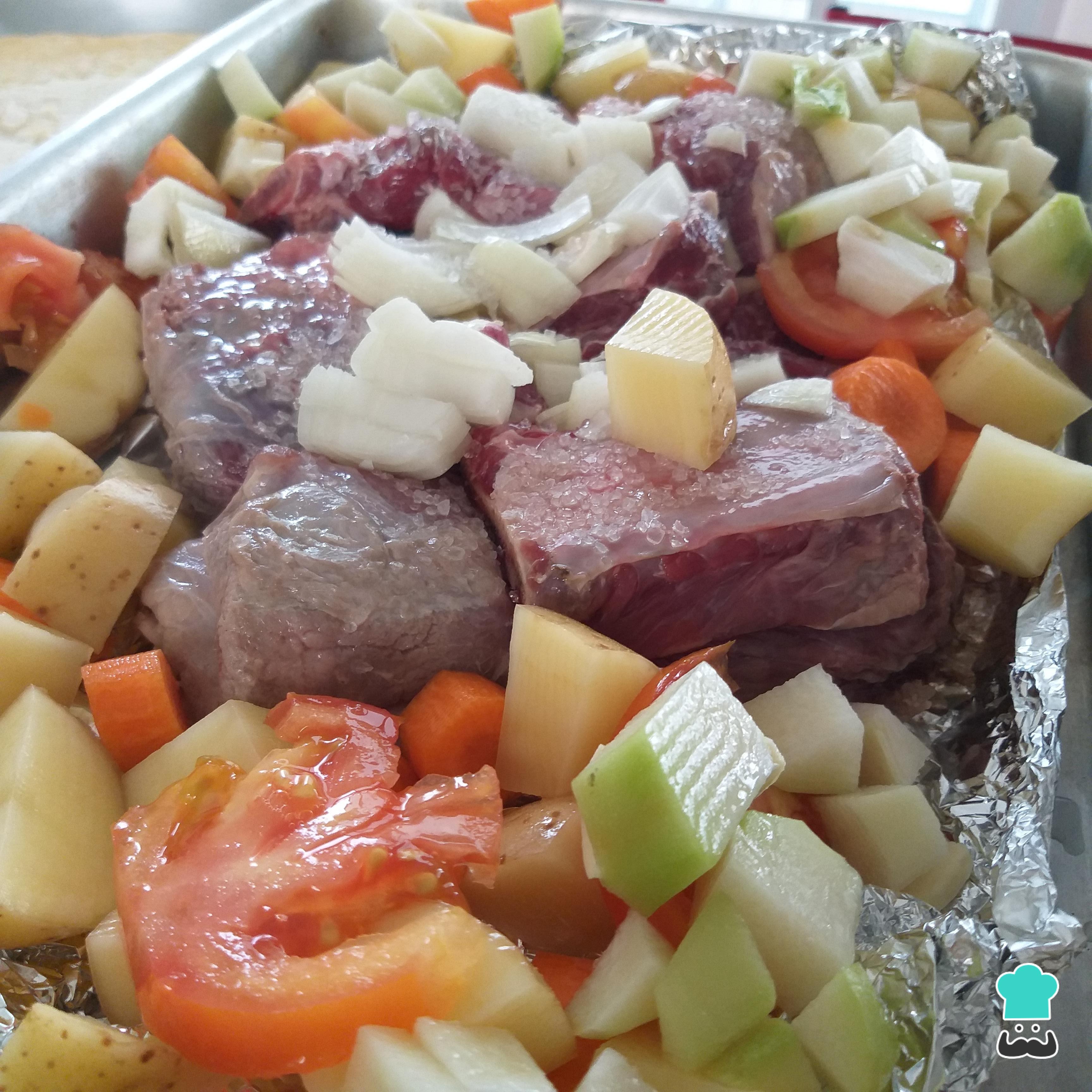 Depois dos 30 minutos retire o papel alumínio, acrescente os legumes de sua preferência e deixe assar por mais 45 minutos ou até a carne ficar macia.