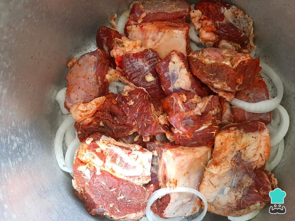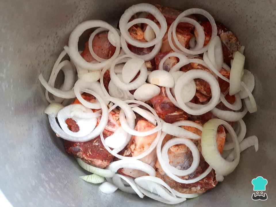 Após a carne ficar marinando no tempero, coloque uma camada de rodelas de cebolas no fundo de uma panela de pressão e acomode a carne sobre as cebolas.