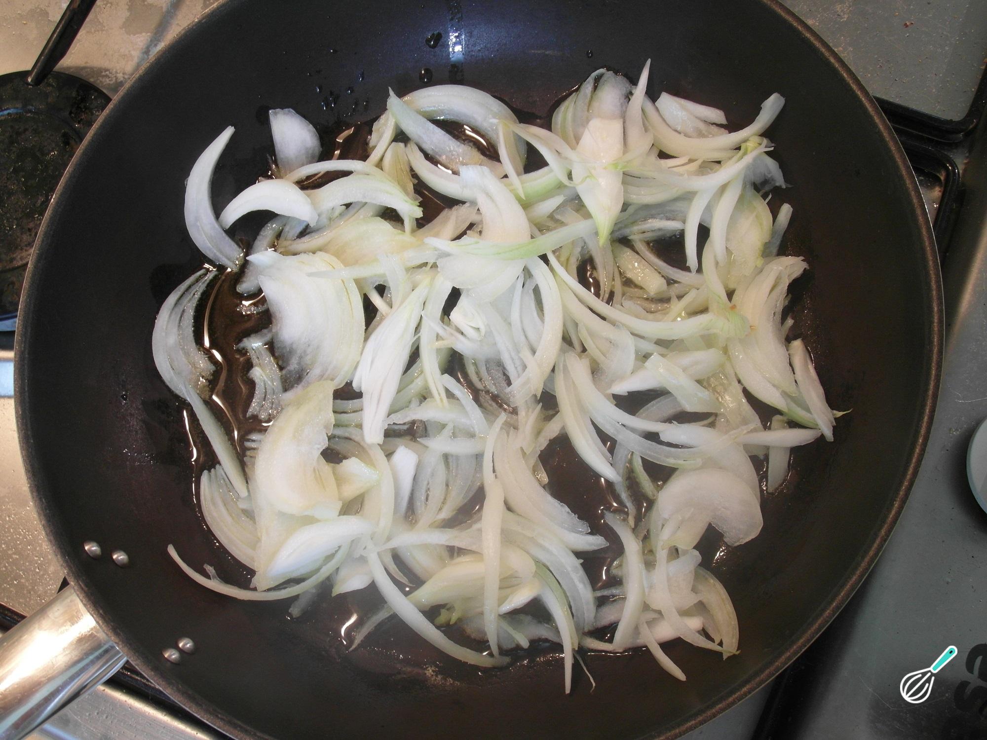 Comece por cortar a cebola e o pimentão em tiras. Numa frigideira ou panela em fogo médio-baixo com metade do azeite refogue os dois ingredientes, mexendo de vez em quando, até que estejam bem macios.