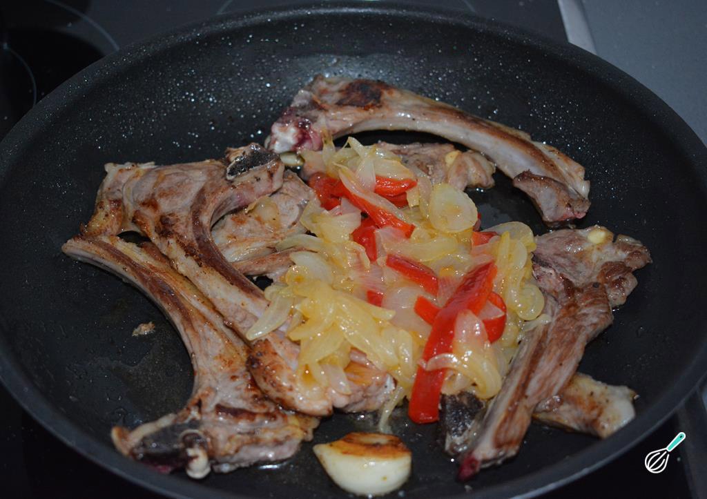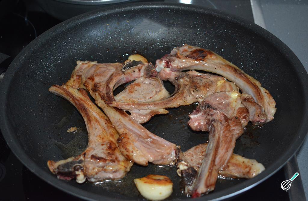 Depois de refogar a cebola tempere a carne de cordeiro com sal e pimenta a gosto. Frite em uma frigideira com o restante azeite e os alhos até que esteja dourada de ambos os lados.
