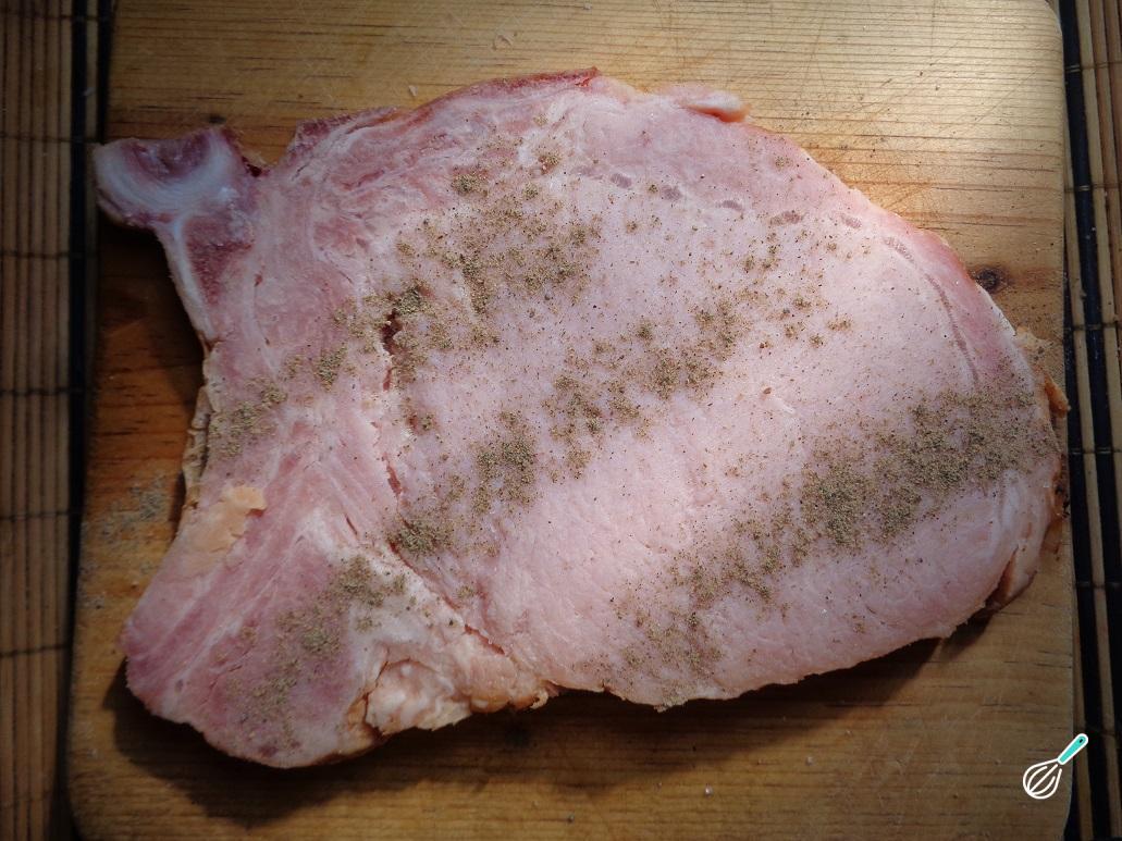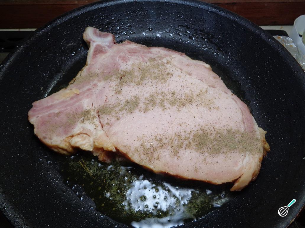 Comece por temperar as costeletas de porco com sal e pimenta do reino.