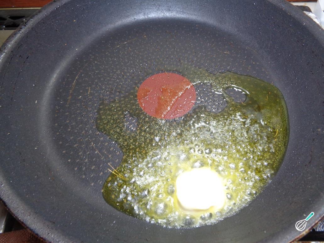 Coloque o azeite, juntamente com a manteiga em uma frigideira e deixe que se juntem.