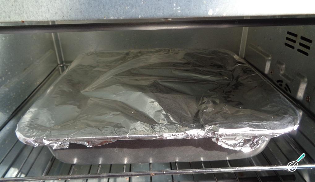 Cubra o refratário com papel de alumínio e leve ao forno pré-aquecido a 180ºC por 15 minutos.