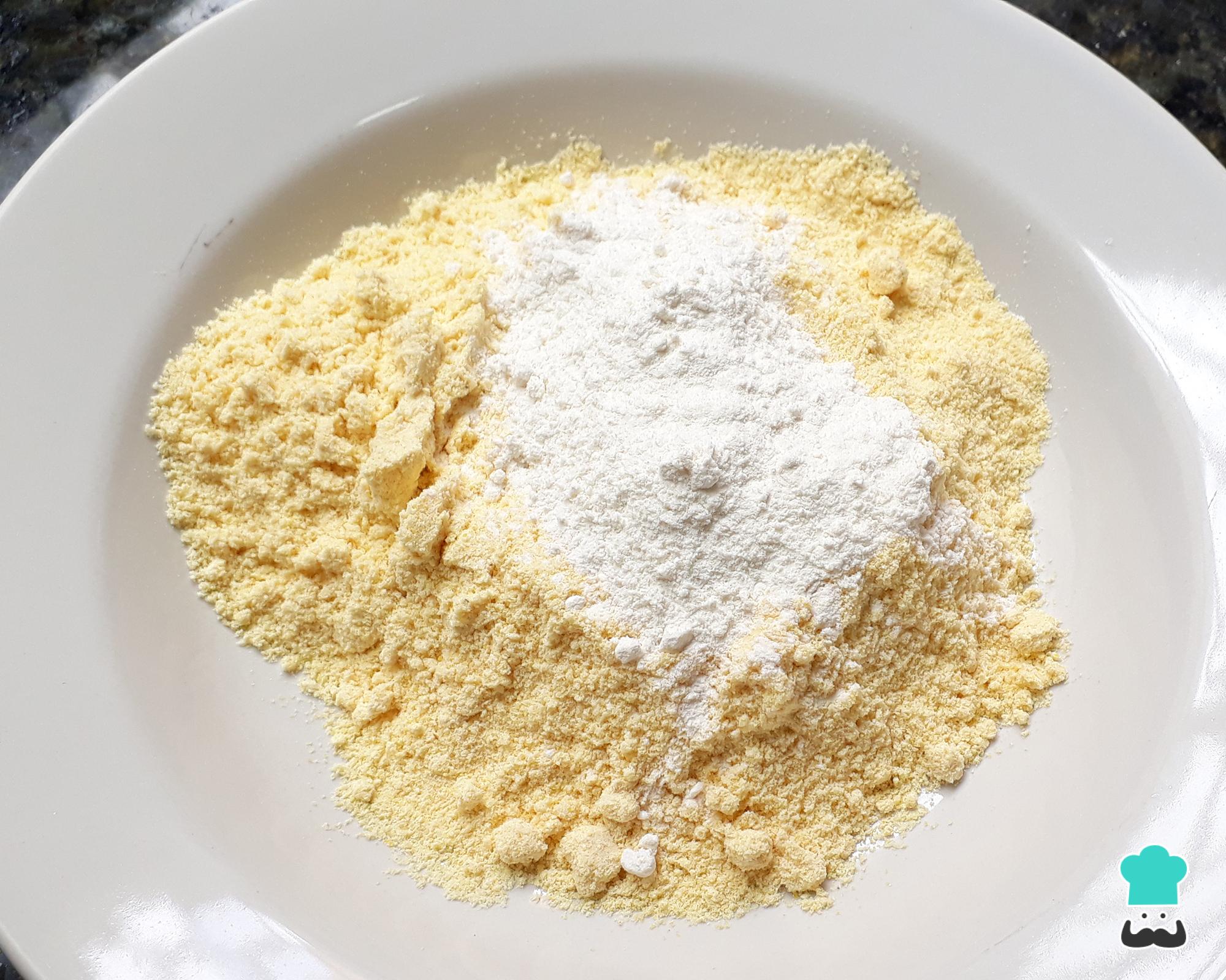 Em um prato fundo, misture o fubá com o trigo - estes ingredientes serão usados para empanar a costelinha de pacu.