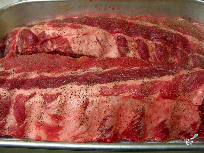 Para fazer costelinha de porco assada com molho barbecue, a primeira coisa que precisa de fazer é temperar o entrecosto com sal e pimenta a gosto. Pré-aqueça o forno a 160 ºC.