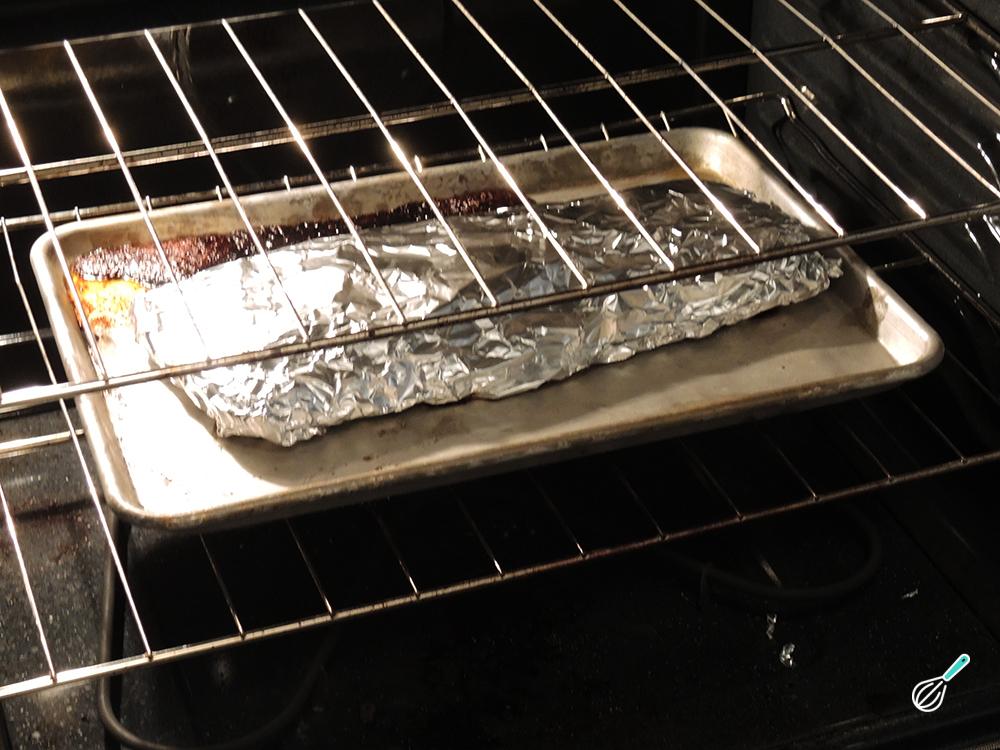 Cubra a costelinha de porco com papel alumínio. Deve ficar sem nenhuma abertura para que o calor e o suco da carne não saiam. Asse no forno por uma hora e meia. Após os primeiros 30 minutos, retire a assadeira do forno, abra o papel e cubra generosamente com o molho.
