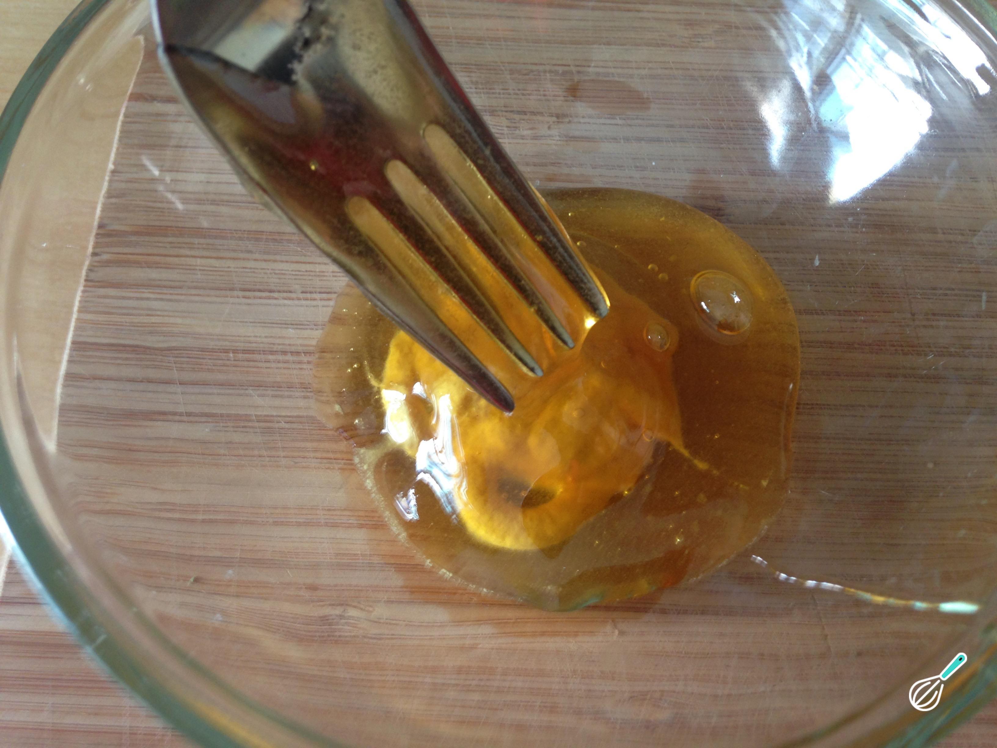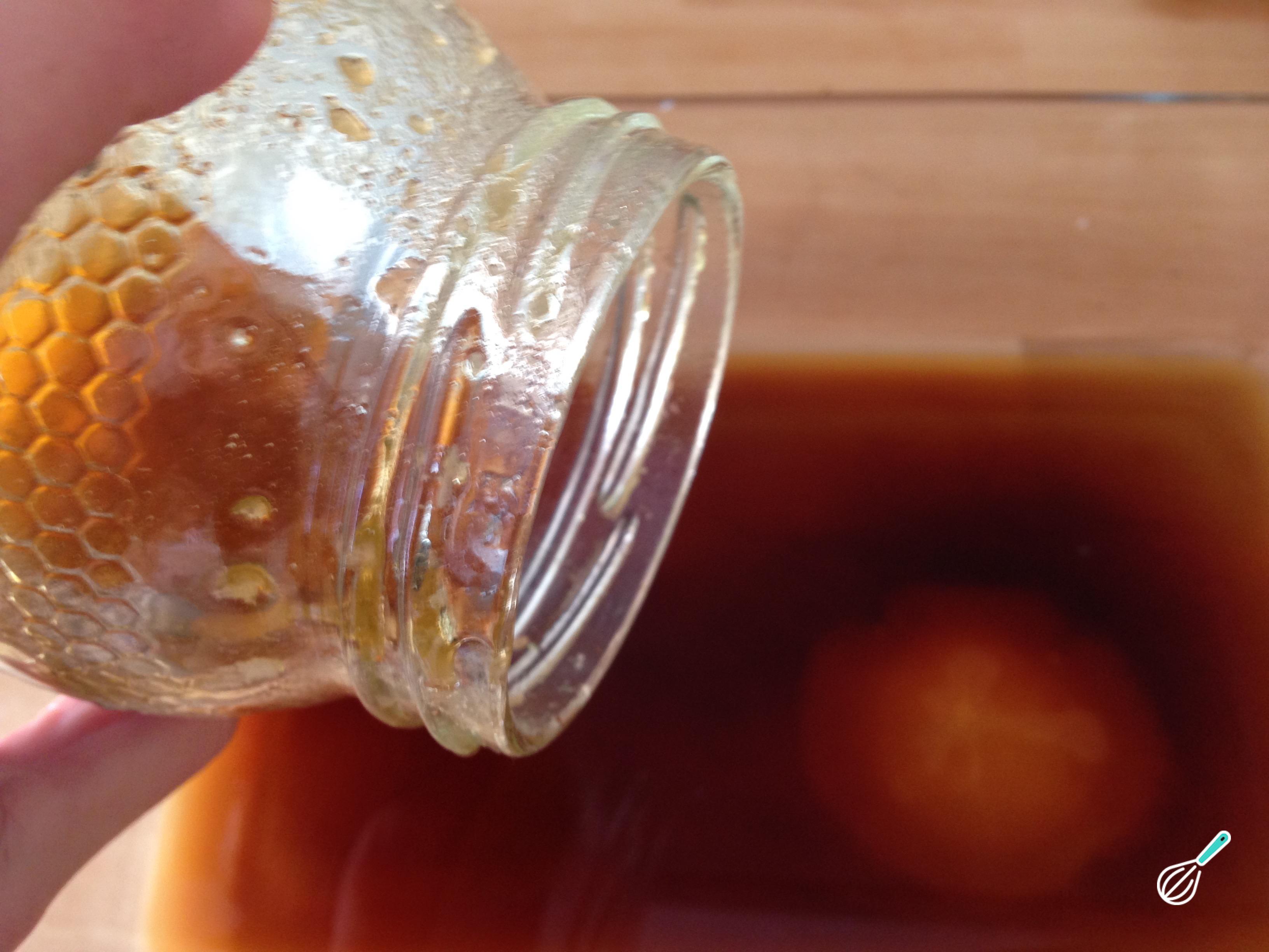Prepare o molho para marinar as costelinha à base de soja: misture o shoyu com 1 colher de sopa de mel e 2 colheres de sopa de água.
