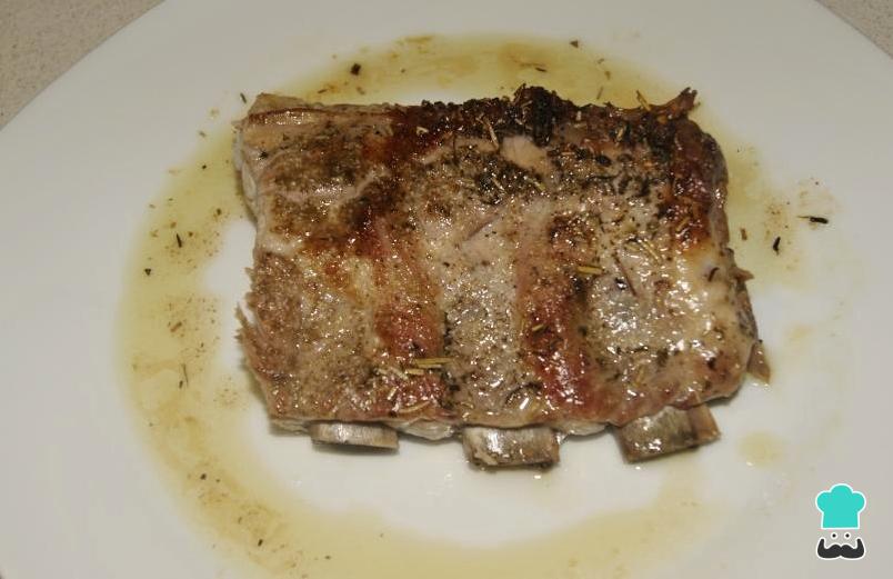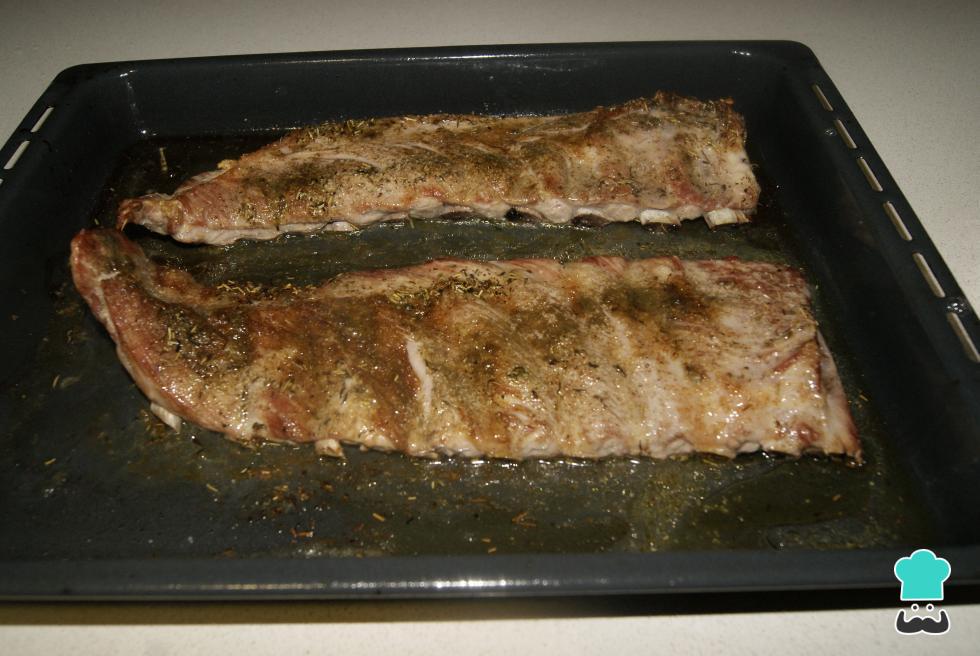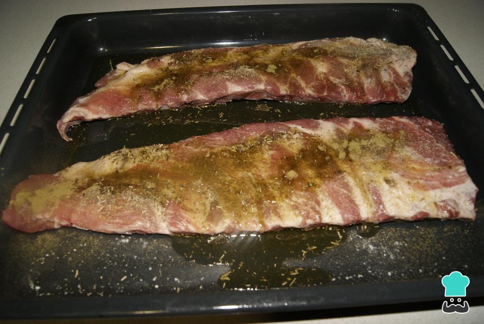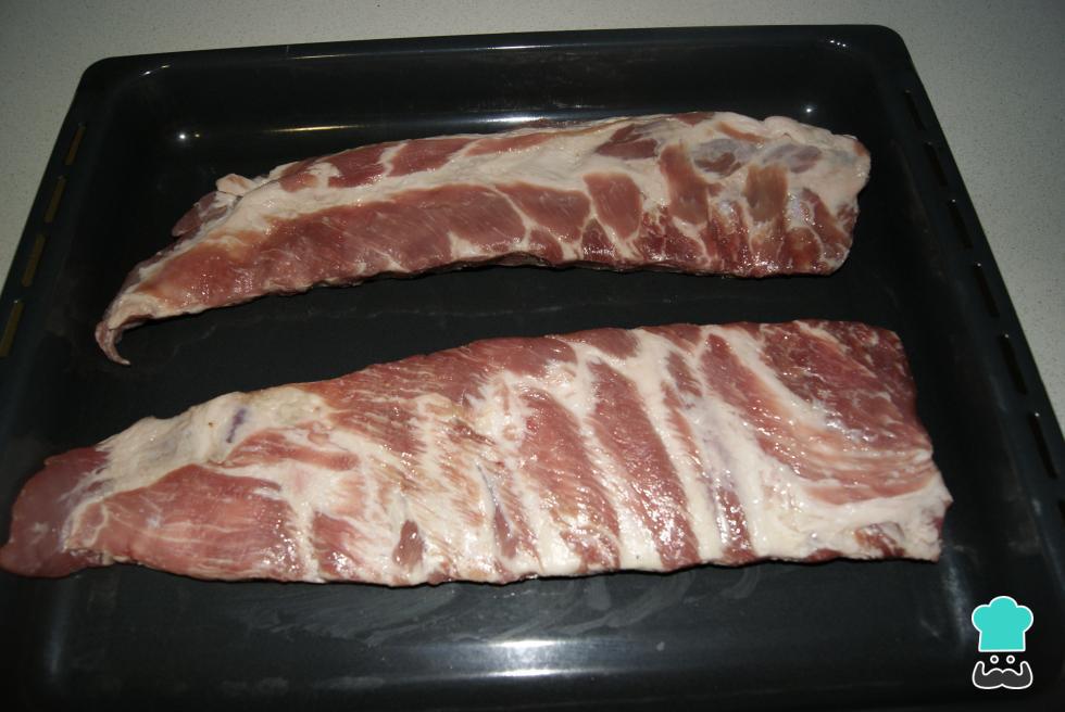 Para preparar esta receita de costela de porco no forno comece por cortar fora o excesso de gordura que a costelinha possa ter. Depois coloque-a em uma assadeira ou tabuleiro de forno.