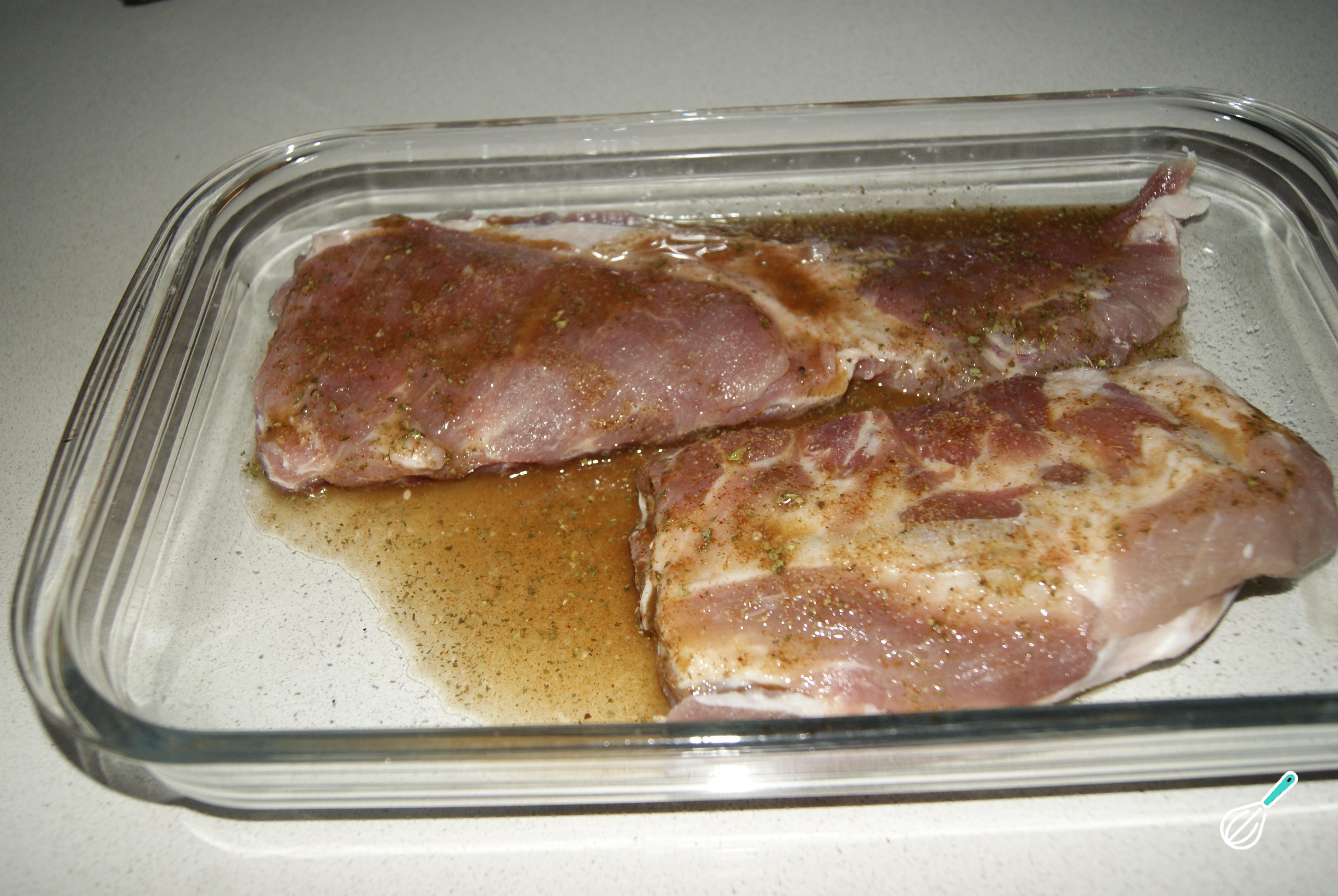 Tempere a costelinha com sal, adicione o suco temperado e deixe marinar por três horas.
