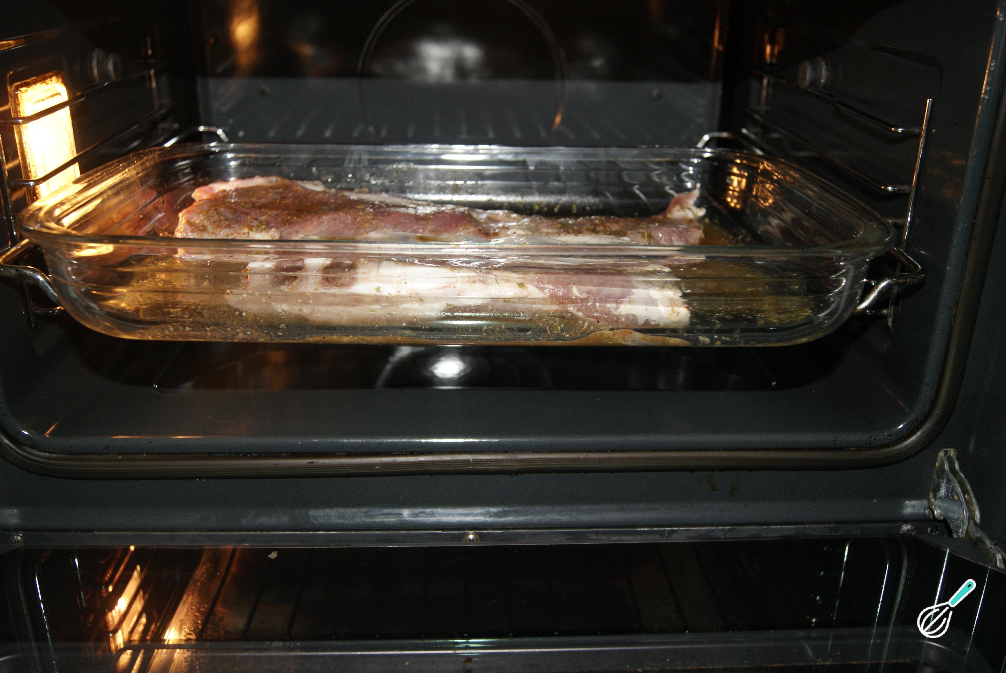 Passado o tempo da marinada, coloque a costelinha no forno a cento e oitenta graus.