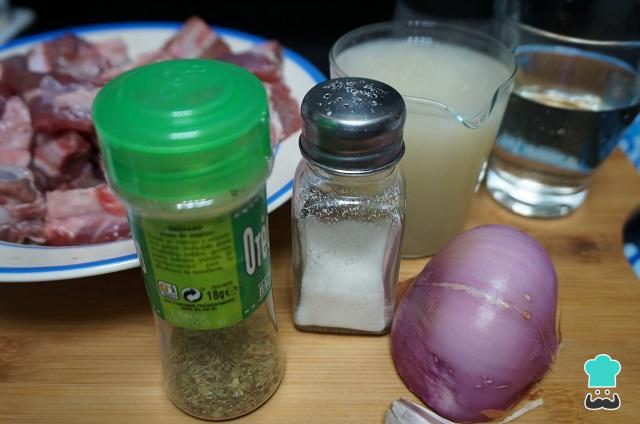 Comece por reunir todos os ingredientes necessários ao preparo desta receita de carne de porco frita.