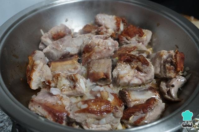 Quando a costelinha dourar, junte a cebola e o alho picados e misture. Estes ingredientes simples fazem toda a diferença no sabor da costela suína frita, por isso não deixe de adicionar!