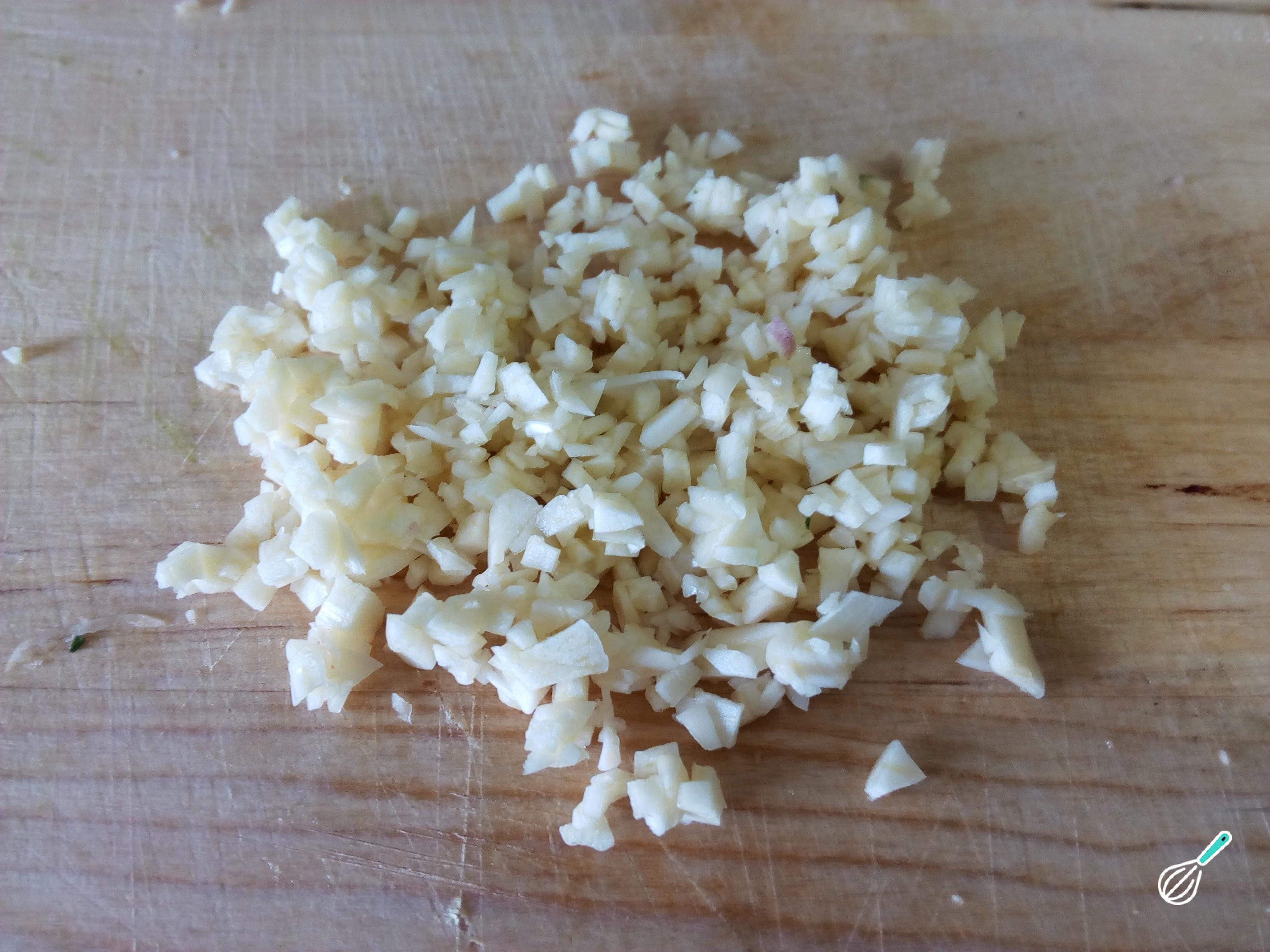 Retire as couves da panela e reserve a água de cozedura para usar daqui a pouco. À parte descasque e pique os dentes de alho. Se tem salsinha fresca, pique também.