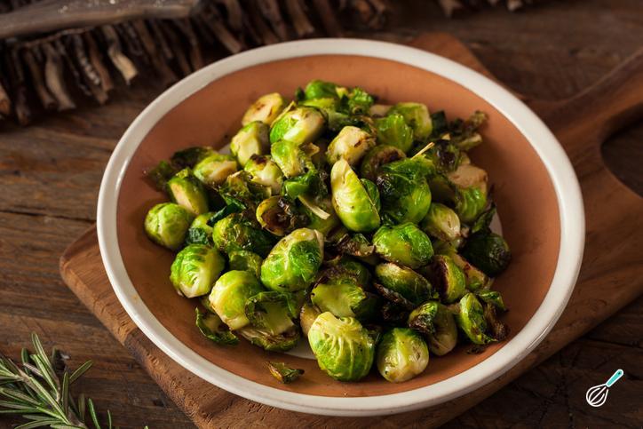 Sirva as couves de Bruxelas ao alho de imediato e desfrute acompanhadas de verduras salteadas.