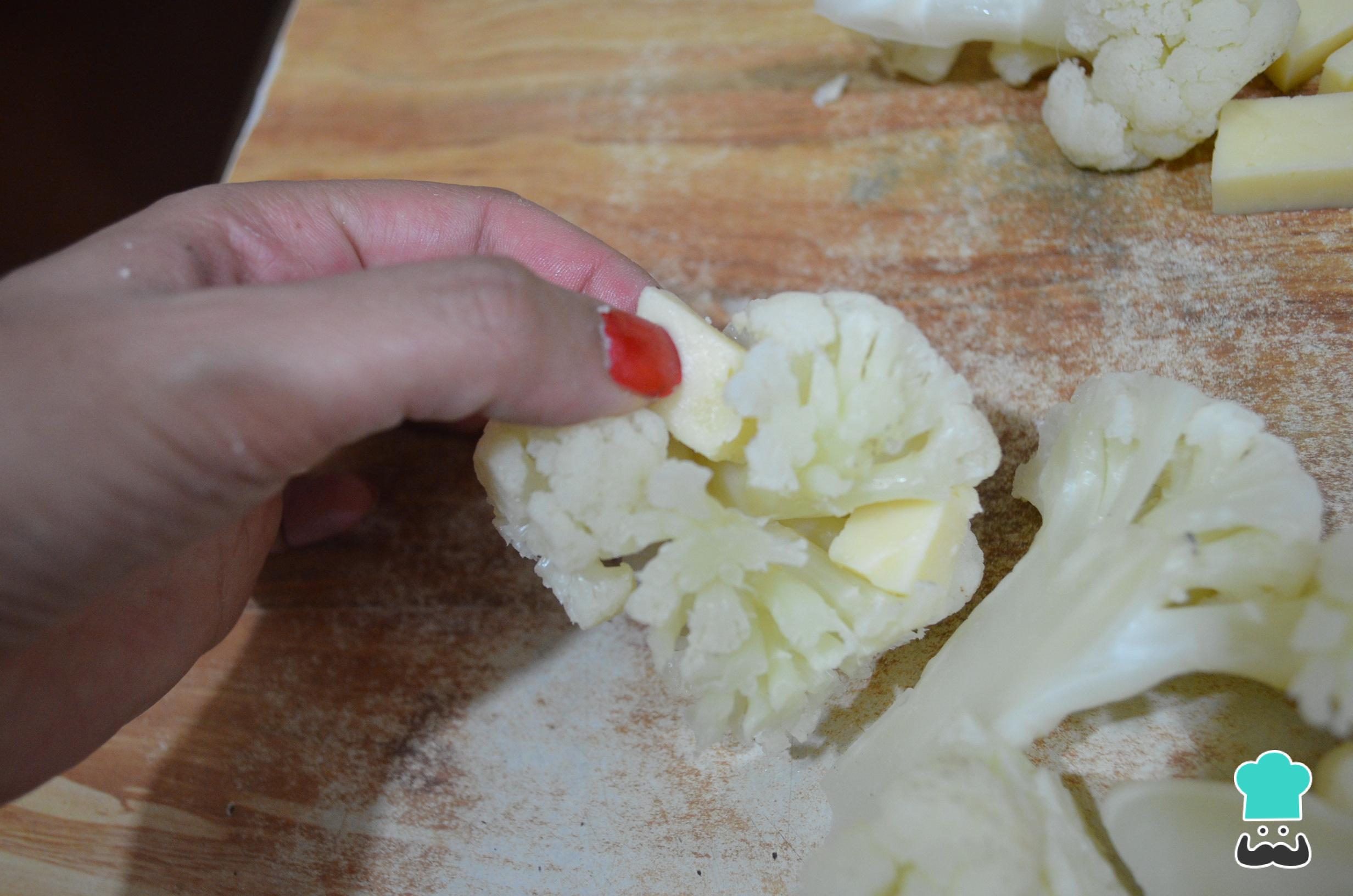 Para preparar essa receita comece por lavar a couve-flor, cortar em pedaços e cozinhar em uma panela com água fervente e sal durante 4 minutos. Escorra a água, deixe esfriar e coloque um pouco de queijo entre cada pedaço de couve-flor.
