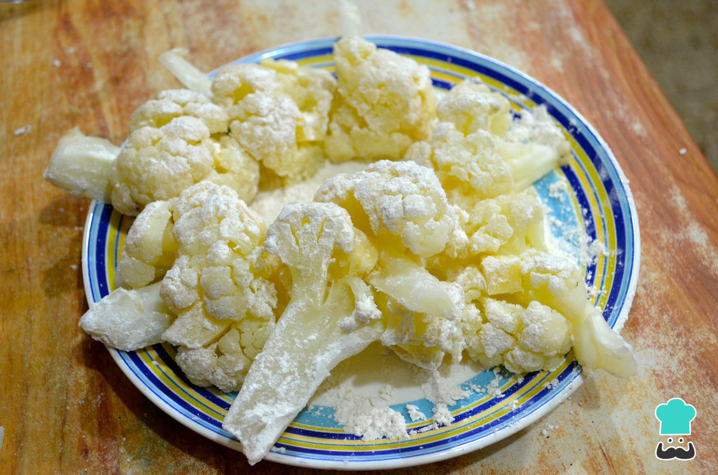 Em seguida envolva a couve-flor em farinha e sacuda, para retirar o excesso. Leve também ao fogo uma panela com óleo, para esquentar e fritar a couve-flor dentro de minutos.