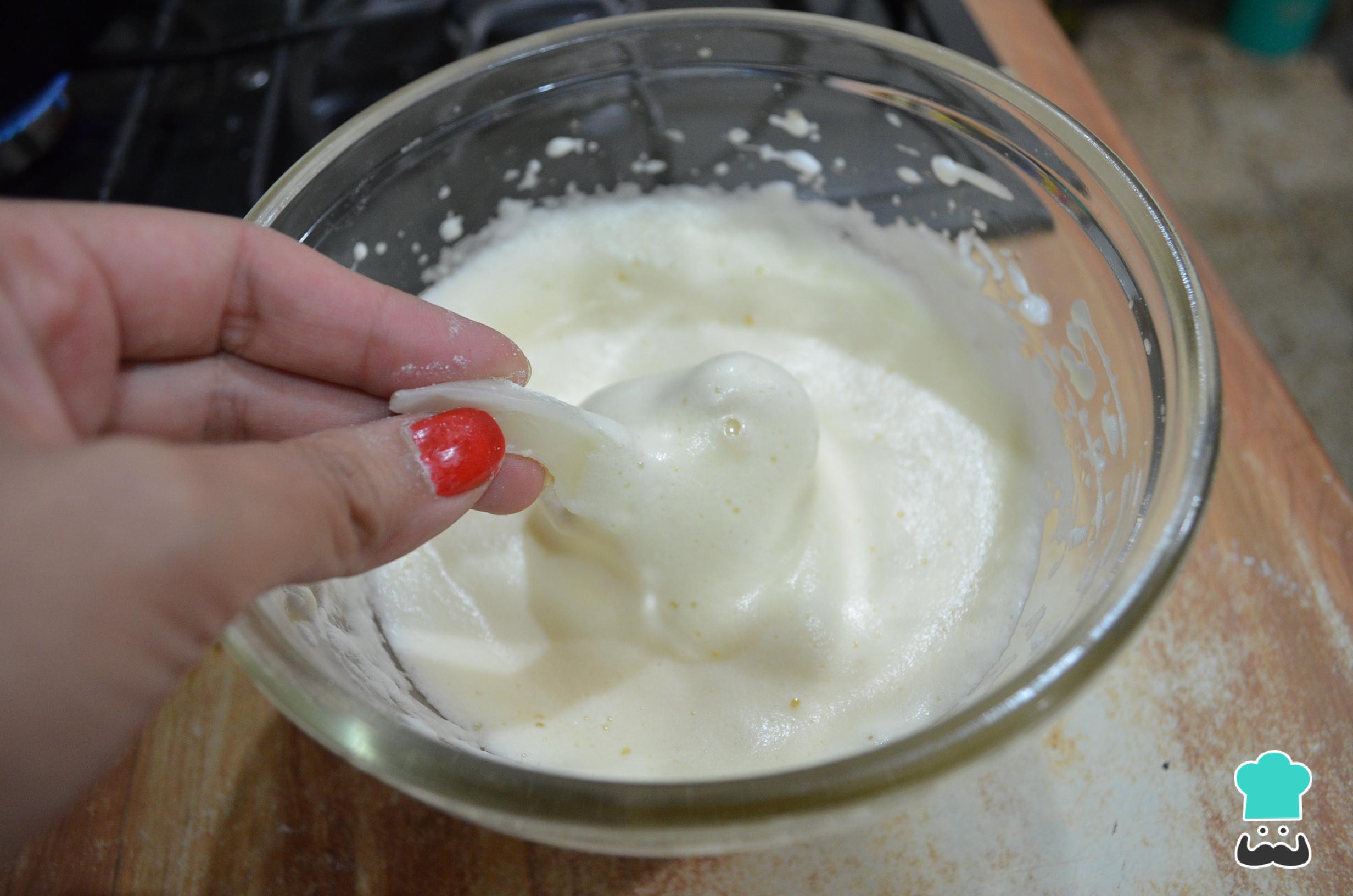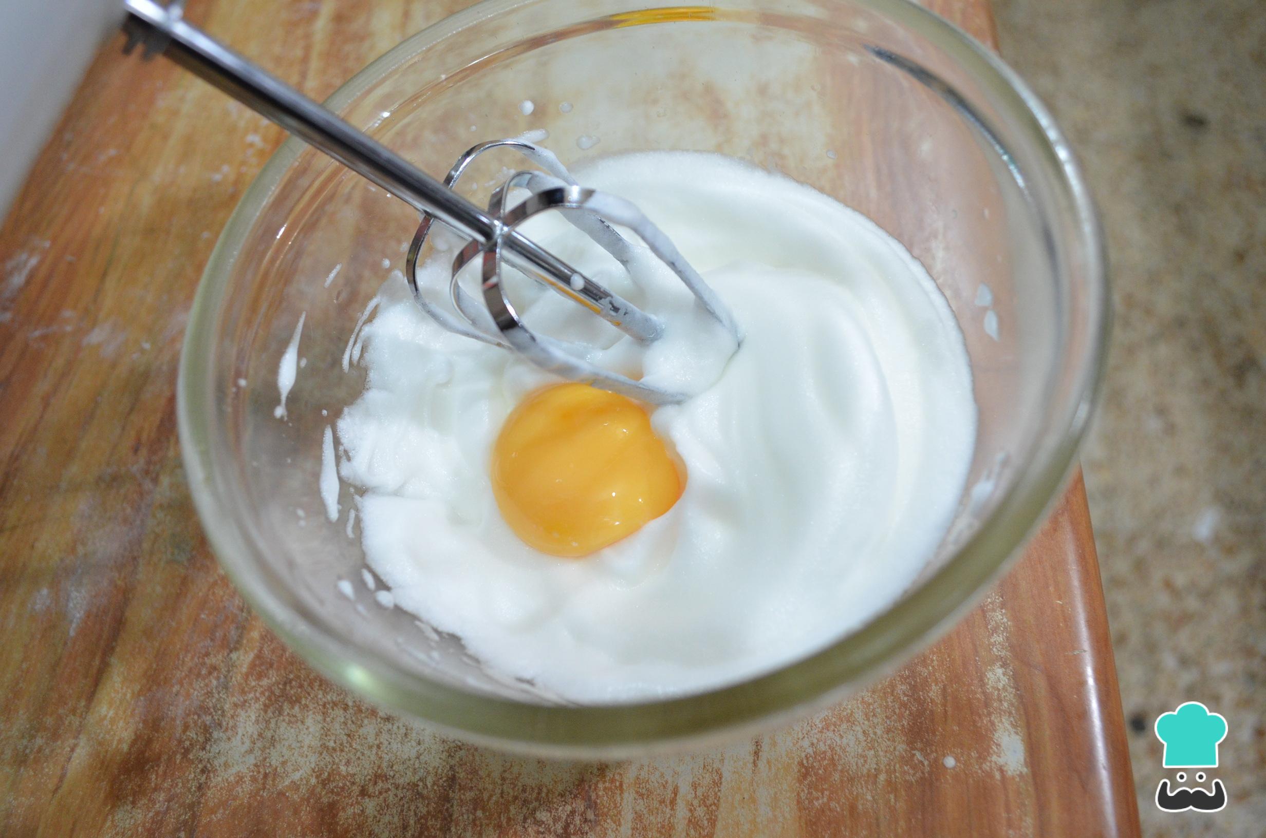 Separe as claras das gemas dos ovos. Bata as claras em neve, até que formem picos, depois acrescente as gemas e bata em velocidade baixa, para que as claras não percam o volume.