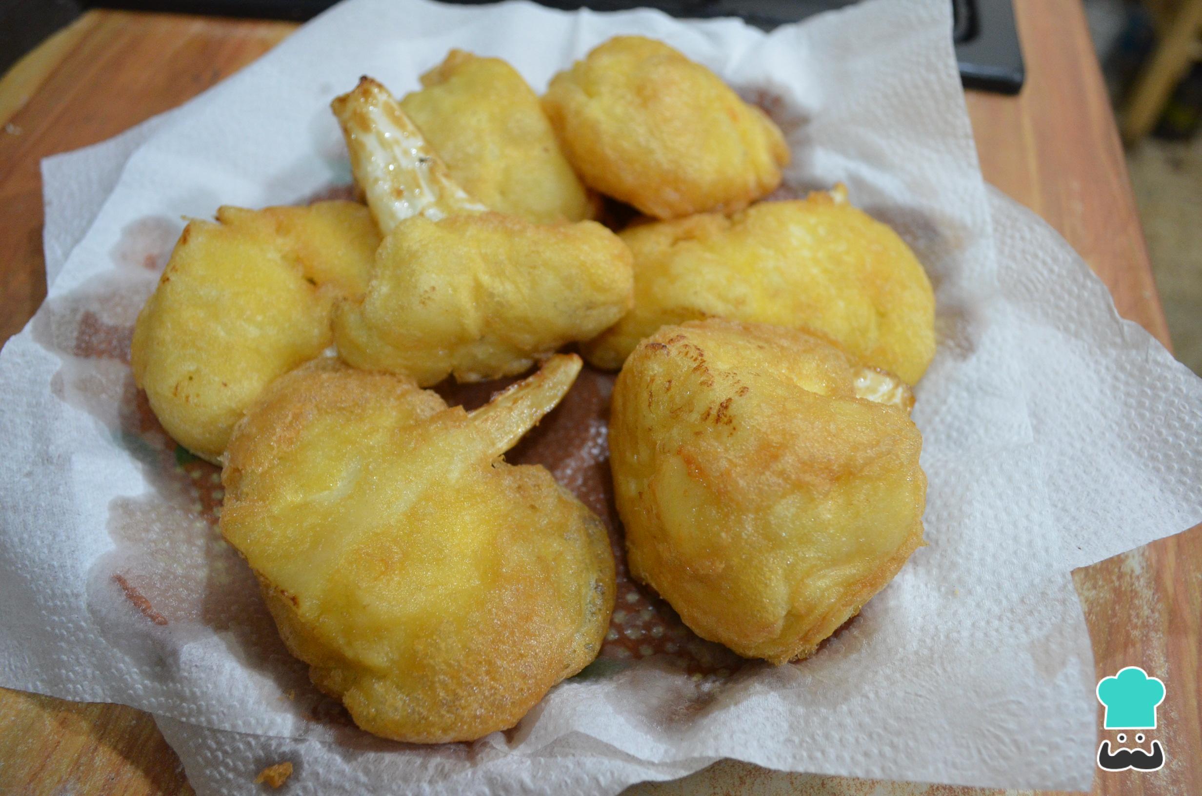 Envolva cuidadosamente as couves-flores na mistura de claras e gemas e coloque fritando no óleo.