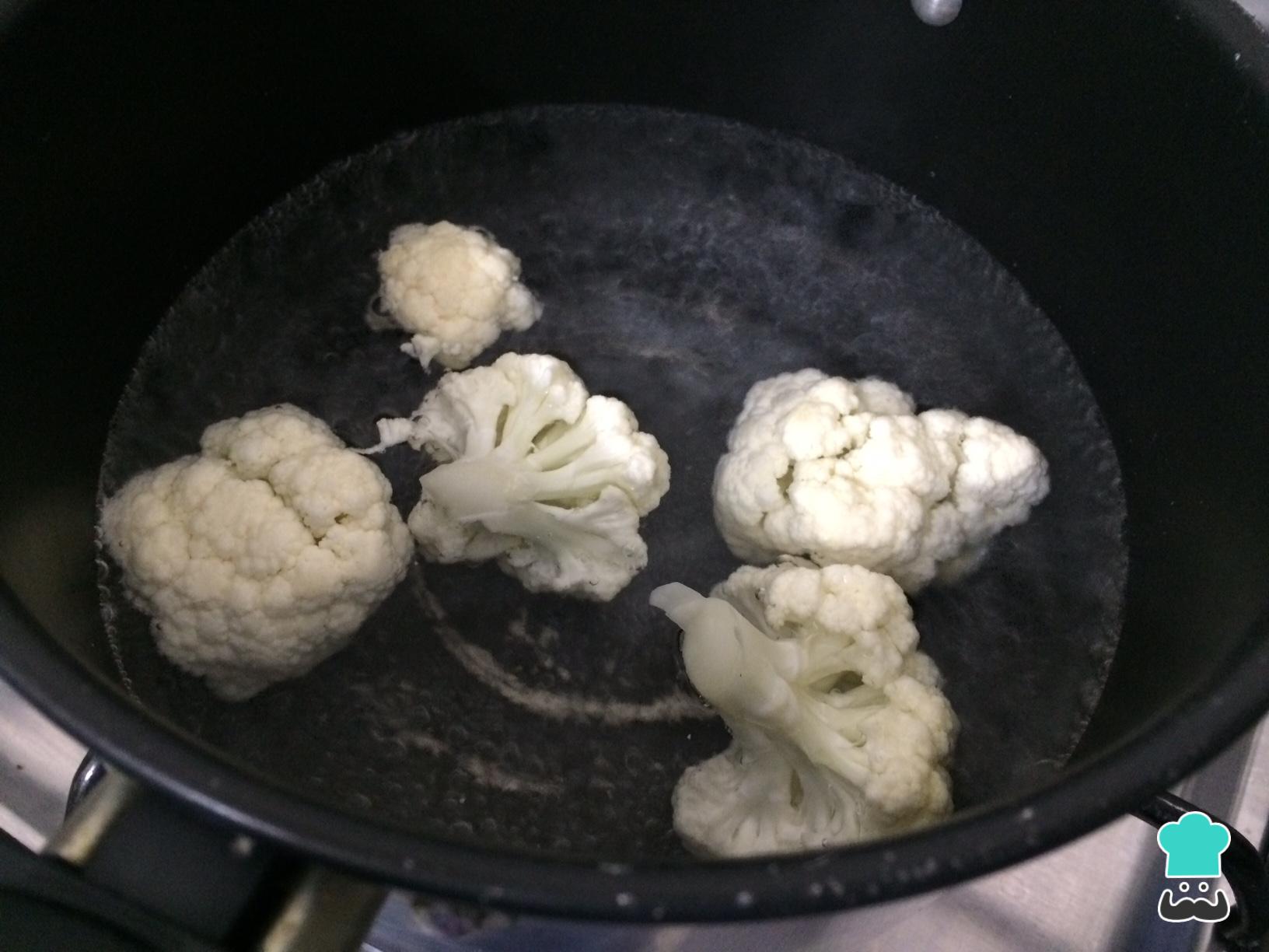 O primeiro passo dessa receita é lavar e cortar a couve-flor em pedaços. Depois cozinhe em uma panela com água fervente durante 10 minutos. No final desse tempo escorra a água.