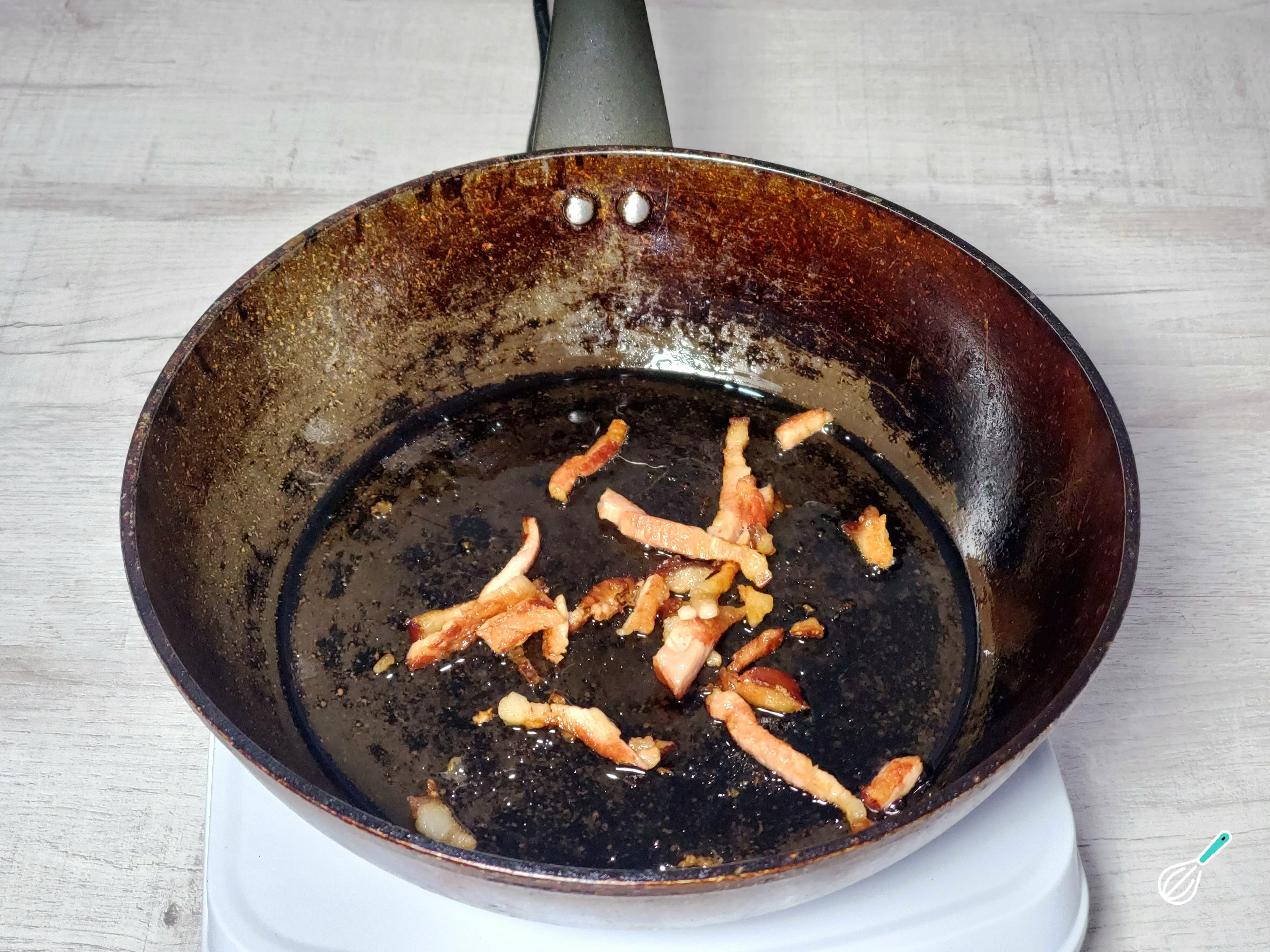 Doure essas tiras colocando-as em uma frigideira fria antes de ligar o fogo. Em seguida, adicione um bom fio de água: isso ajudará o bacon a soltar sua gordura. Depois, deixe dourar até adquirirem cor. Reserve.