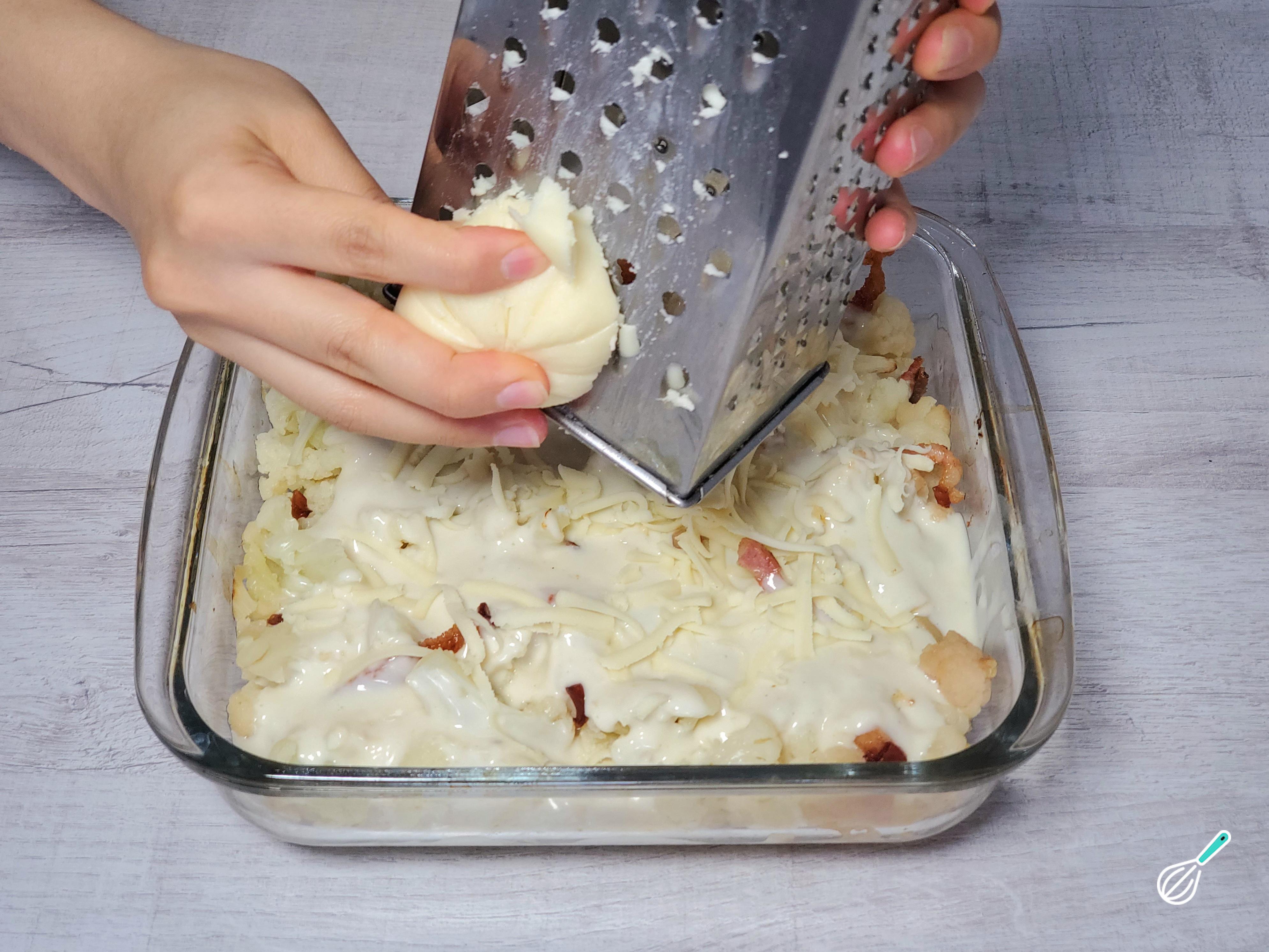 Em uma assadeira própria para forno, coloque a couve-flor e o bacon na base. Despeje o molho bechamel por cima, garantindo que cubra bem, e finalize com queijo mussarela ralado para obter um gratinado perfeito.
