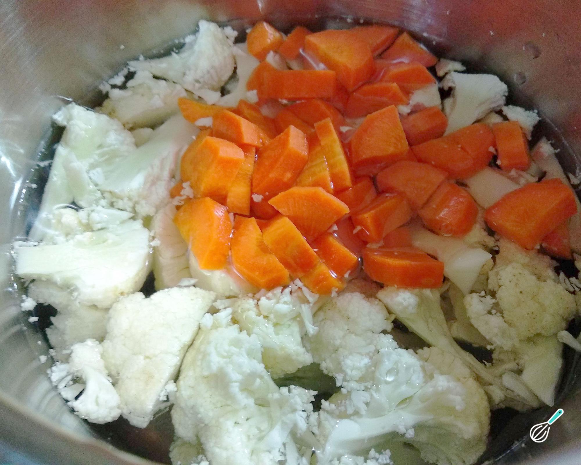 Dica: É importante que os pedaços de couve flor e de cenoura tenham mais ou menos o mesmo tamanho, para que cozinhem por igual.