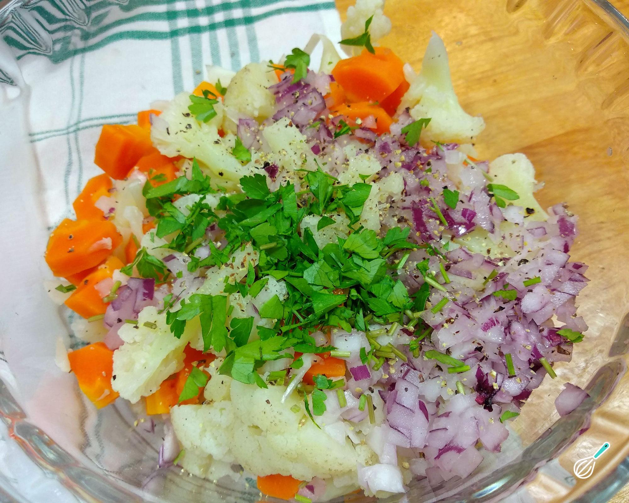 Escorra a água e coloque os legumes numa tigela. Deixe esfriar completamente ou até amornarem e então coloque os restantes temperos: a cebola picada, a salsinha picada e pimenta a gosto. Adicione a maionese e misture tudo.
