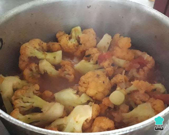 Quando o tomate estiver bem 'molinho' coloque o molho de tomate. Após ferver o molho acrescente a couve-flor, acerte o sal e a pimenta, espere mais uns minutos e desligue o fogo.