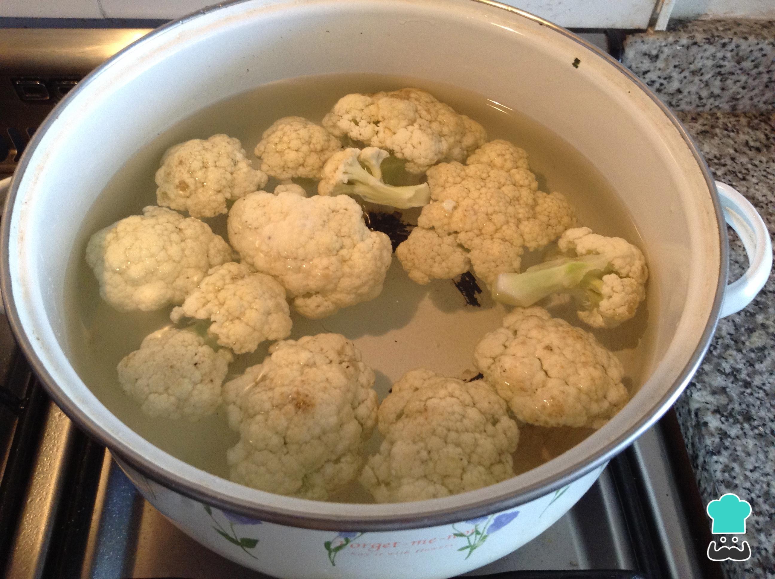 Em uma panela grande ponha água a ferver, assim que estiver a ferver adicione os pedaços de couve-flor e deixe cozinhar até que fiquem macios (15 a 20 minutos de cozimento). Uma vez cozinhados, retire da água quente e coloque em um refratário de vidro.