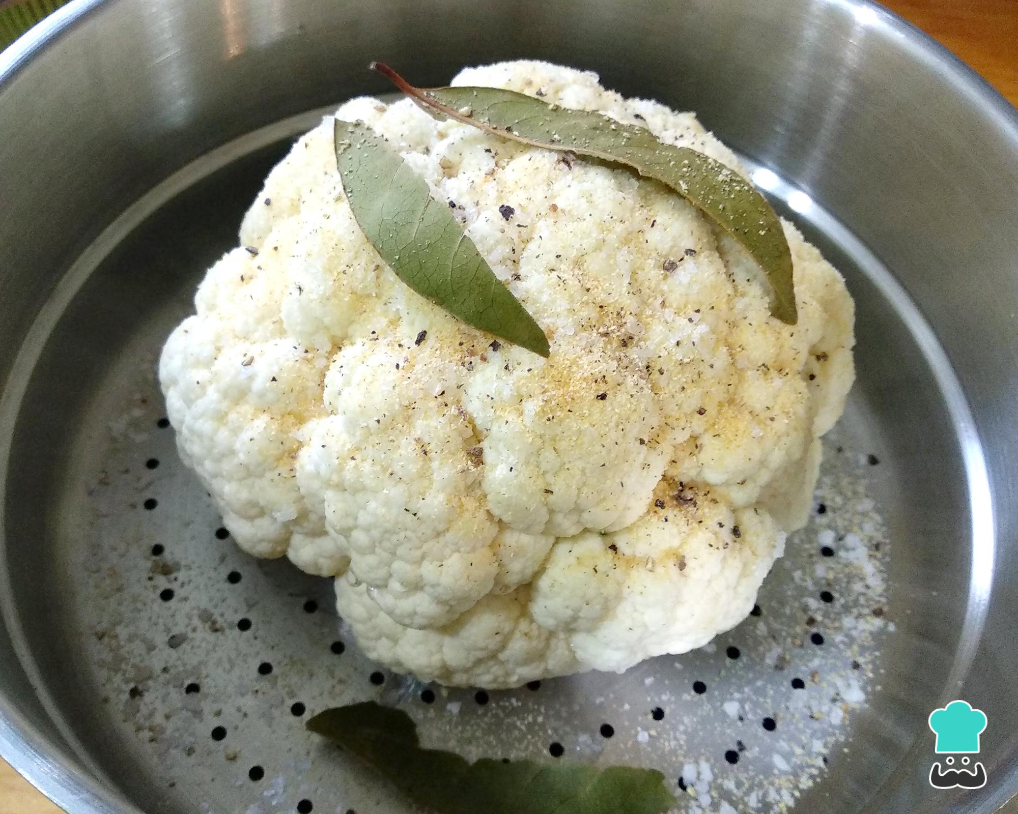 Coloque a couve flor num cesto de vapor, para pré-cozinhar antes de levar ao forno. Tempere com o alho, sal e pimenta do reino, disponha as folhas de louro sobre a couve flor e no cesto de vapor também, para aromatizar.