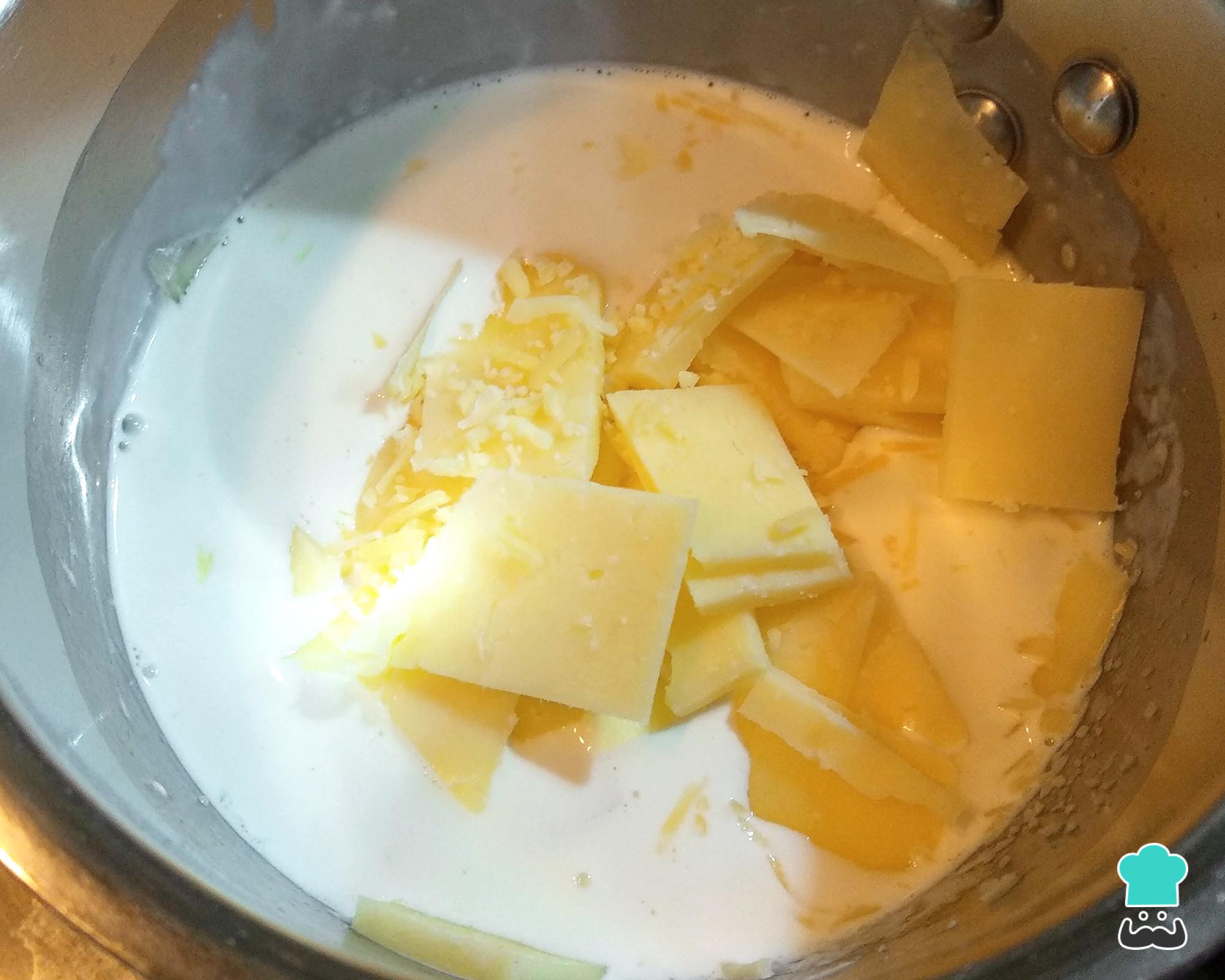 Enquanto isso prepare o molho de queijos: coloque o creme de leite numa panela e leve ao fogo baixo, para esquentar. Quando o creme de leite começar a ferver, suba o fogo, adicione os queijos e misture.