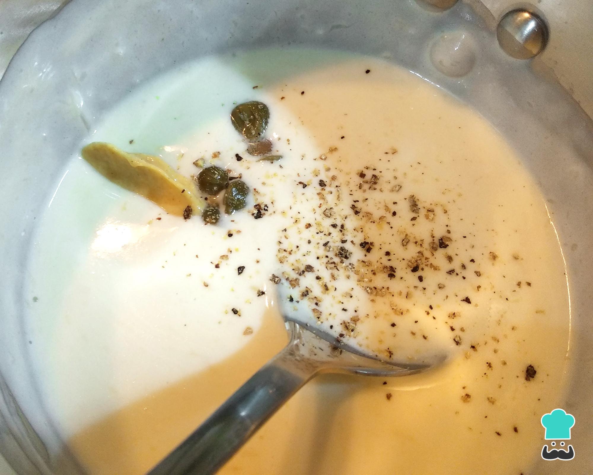Quando os queijos derreterem, incremente o sabor deste molho de queijo adicionando a mostarda, as alcaparras e a pimenta do reino. Prove e, se necessário, coloque sal também.