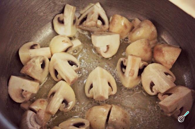 Preaqueça o forno a 200°C. Numa frigideira com o azeite ou margarina refogue os cogumelos fatiados até murcharem.