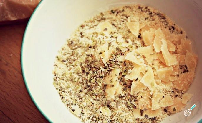 À parte misture a farinha de amêndoas (farinha low carb) com o queijo e as ervas.