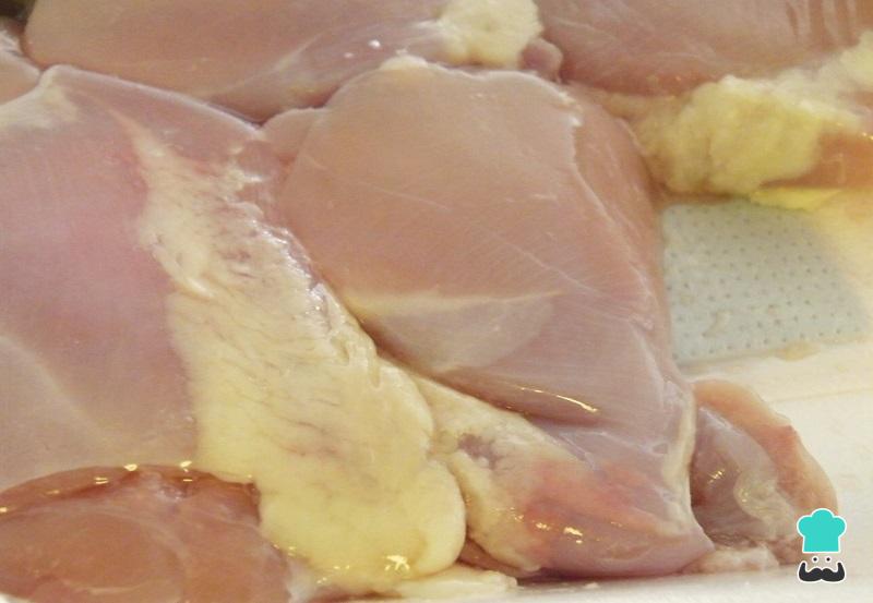 Para fazer essa coxa de frango à milanesa frita, comece por lavar e secar as coxas de frango. Retire a pele e puxe a carne para trás até a extremidade do osso ficar visível.