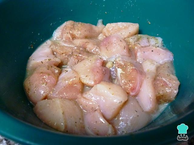 Separadamente, pique o louro em uma tigela, adicione bastante sal e incorpore a coxa de frango. Adicione água até que cobrir a carne e deixe marinar por 10 horas ou durante a noite.