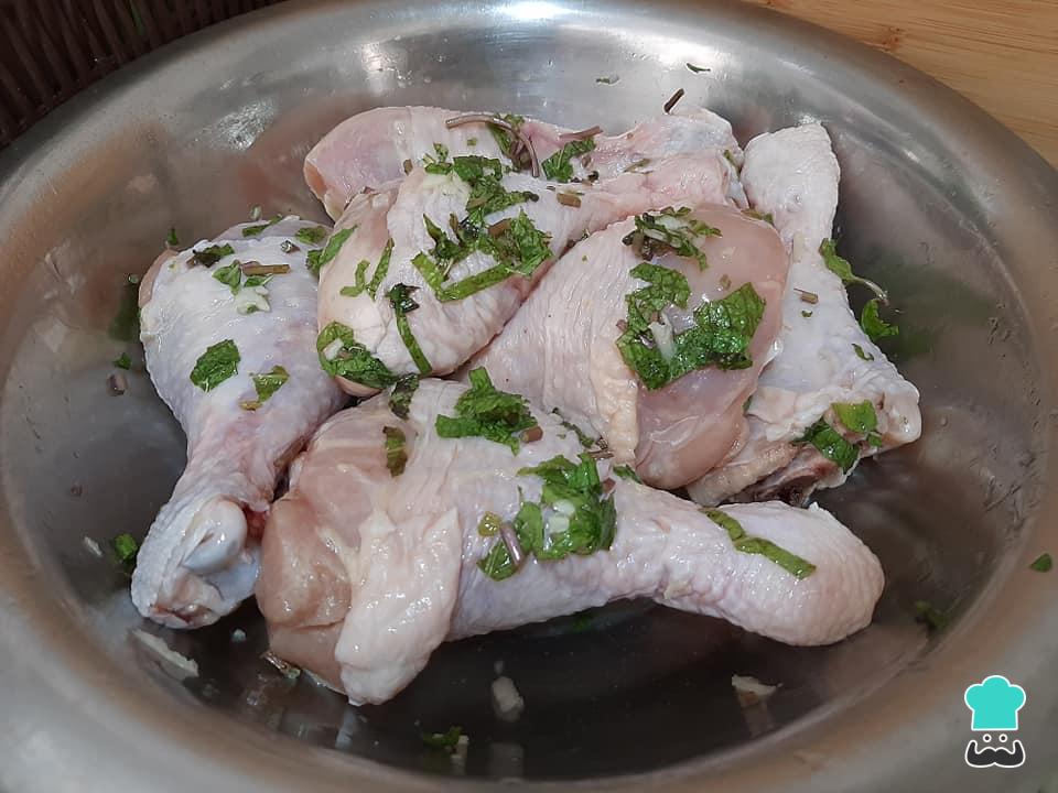 Limpe as coxas de frango, passando limão em todas elas. Tempere as coxas com sal, alho amassado, pimenta do reino, hortelã picada e vinho branco.