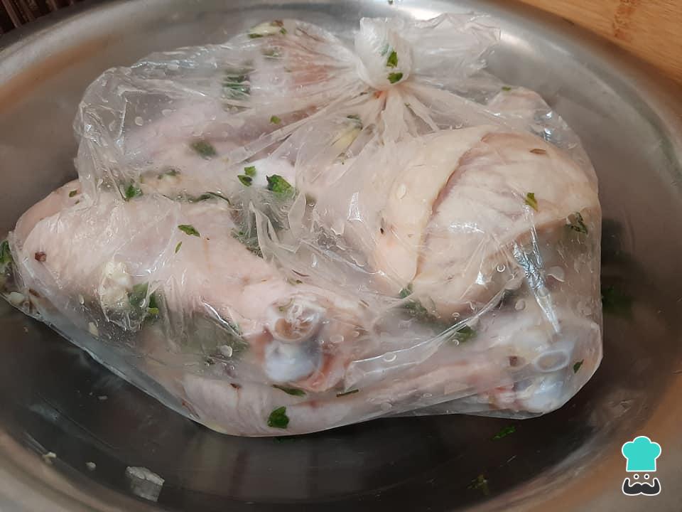 Deixe as coxas de frango marinando por 2 horas neste tempero, de preferência dentro de um saco para o tempero aderir em todas as partes. Leve à geladeira durante este tempo.