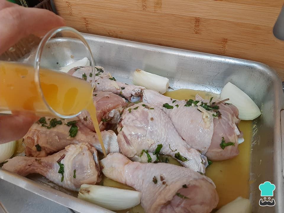 Após esse tempo marinando, acomode as coxas numa assadeira junto com as pétalas de cebola e regue com o suco de laranja. Cubra com papel alumínio (a parte brilhosa para dentro) e leve ao forno pré aquecido por 25 minutos.