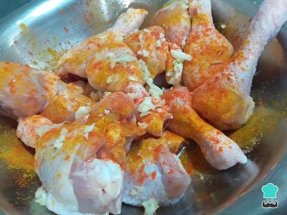 Limpe as coxas de frango e tempere-as com sal, limão, pimenta, páprica, açafrão, alho e ervas.
