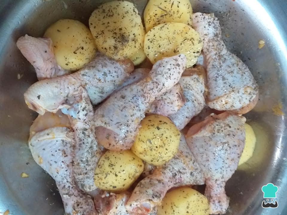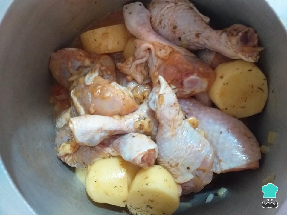Em seguida, acrescente o frango e as batatas com o marinado ao refogado e misture delicadamente. Tampe a panela de pressão e deixe cozinhar por 25 minutos contados a partir do momento que iniciar a pressão.